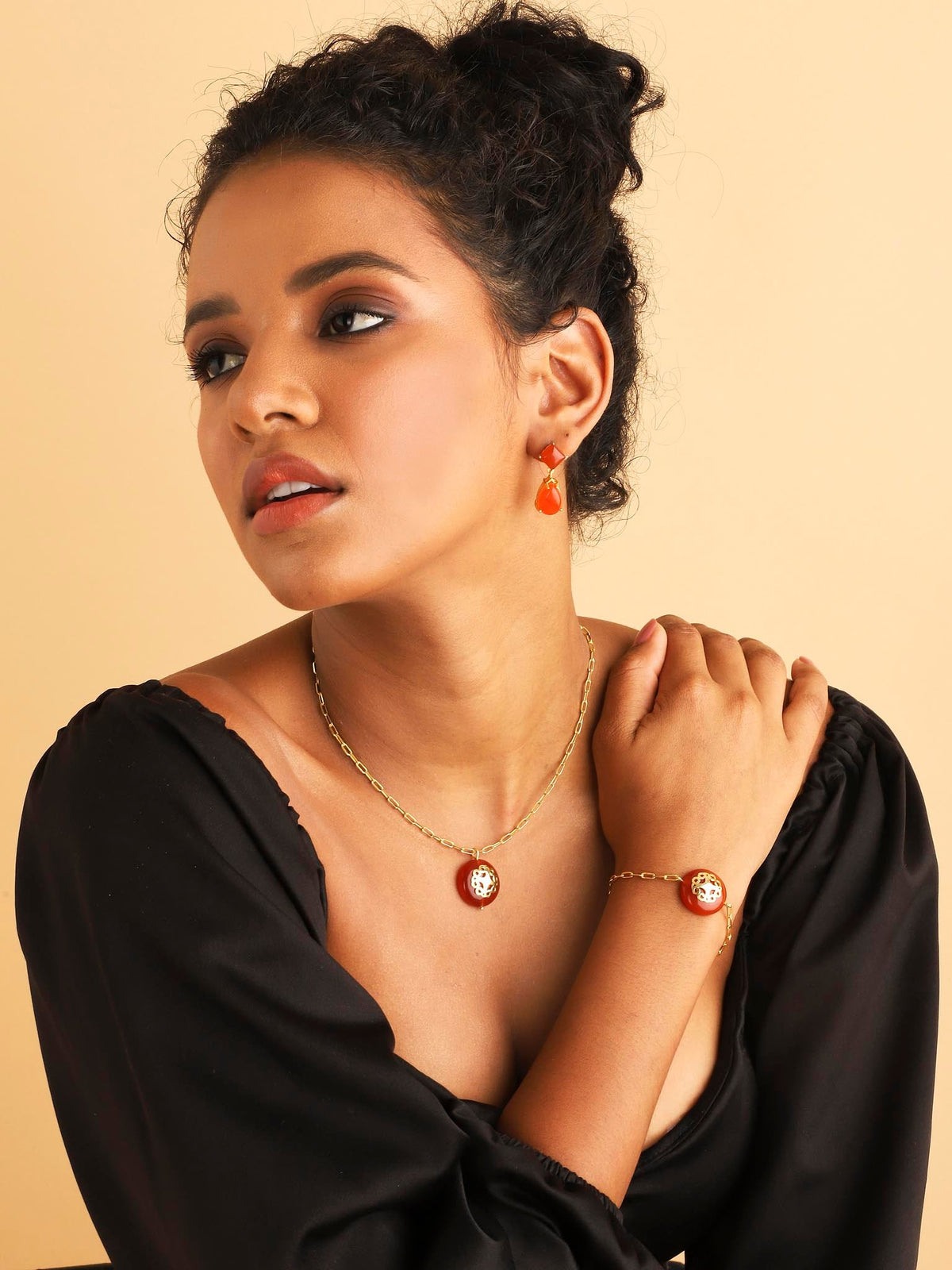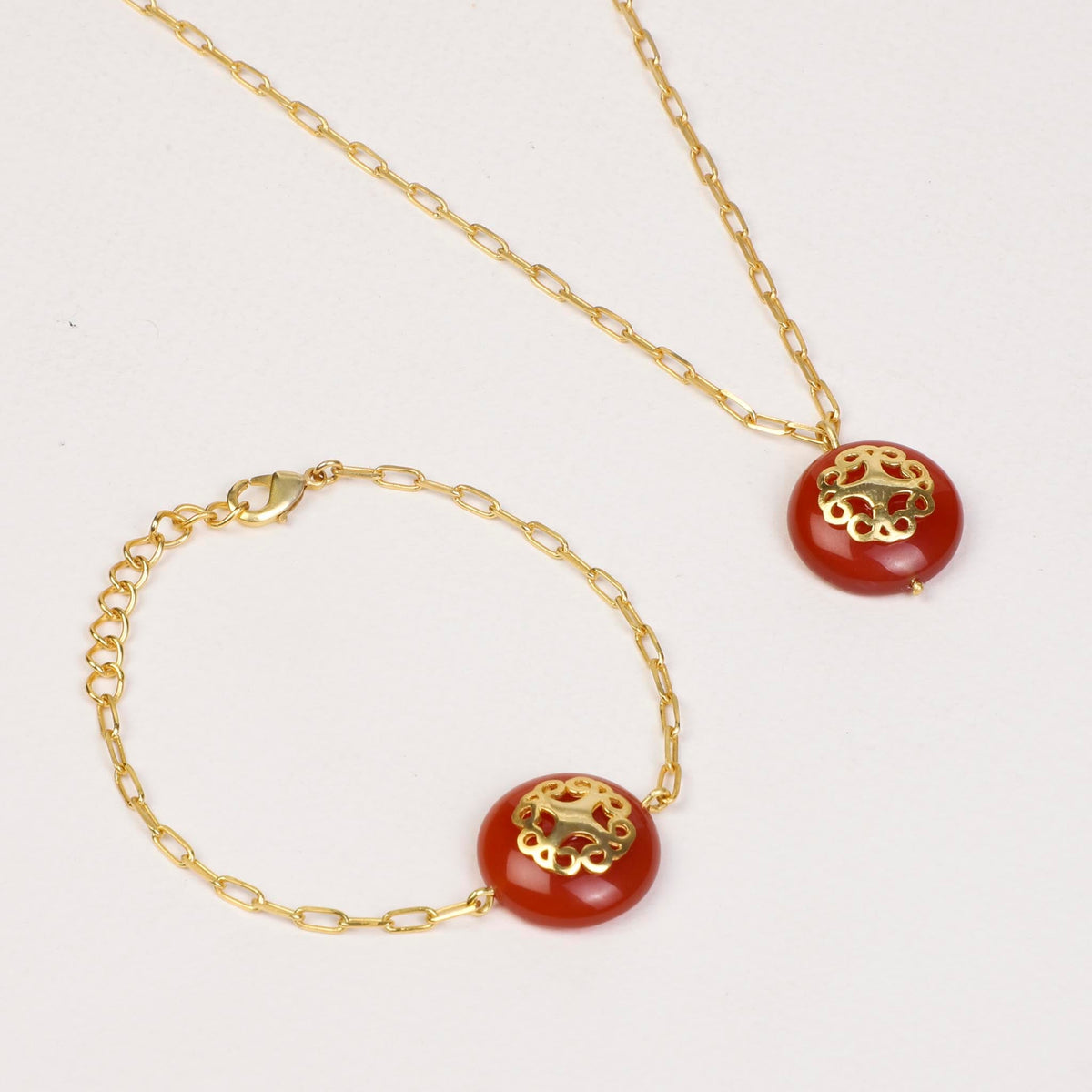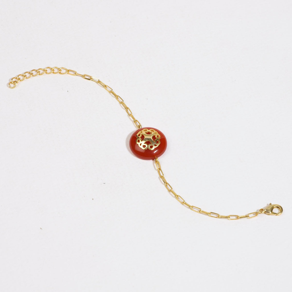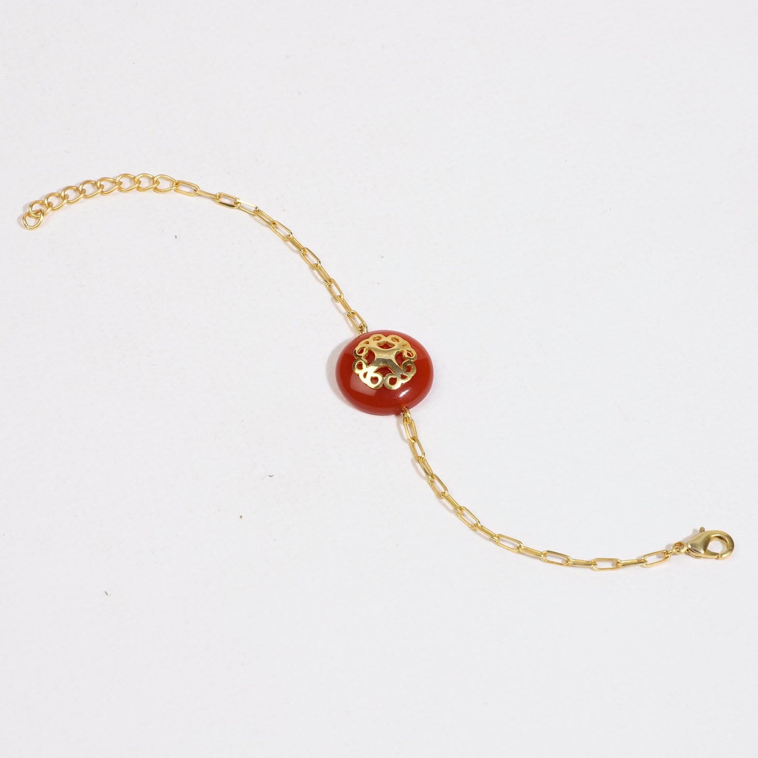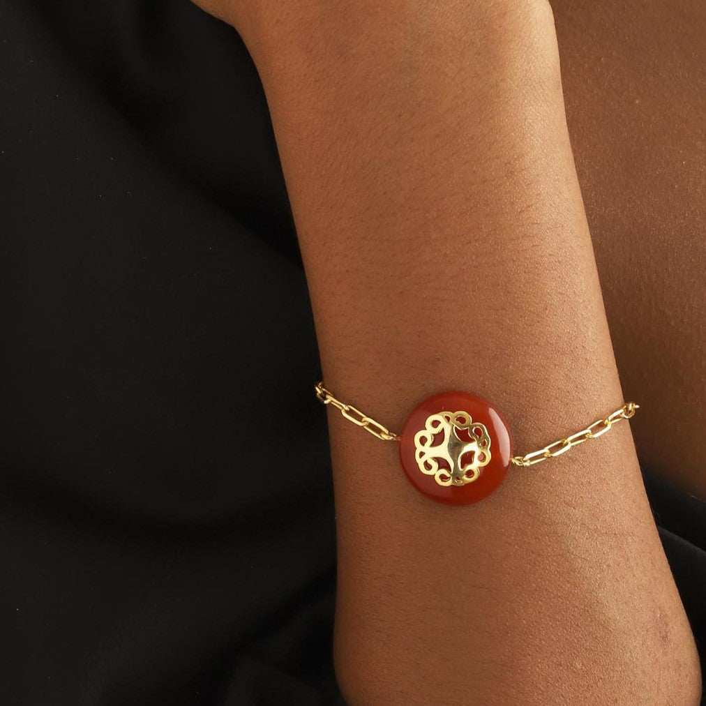 This bracelet is handcrafted with 22 carat gold-plated recycled brass and features carnelian semi-precious stones.