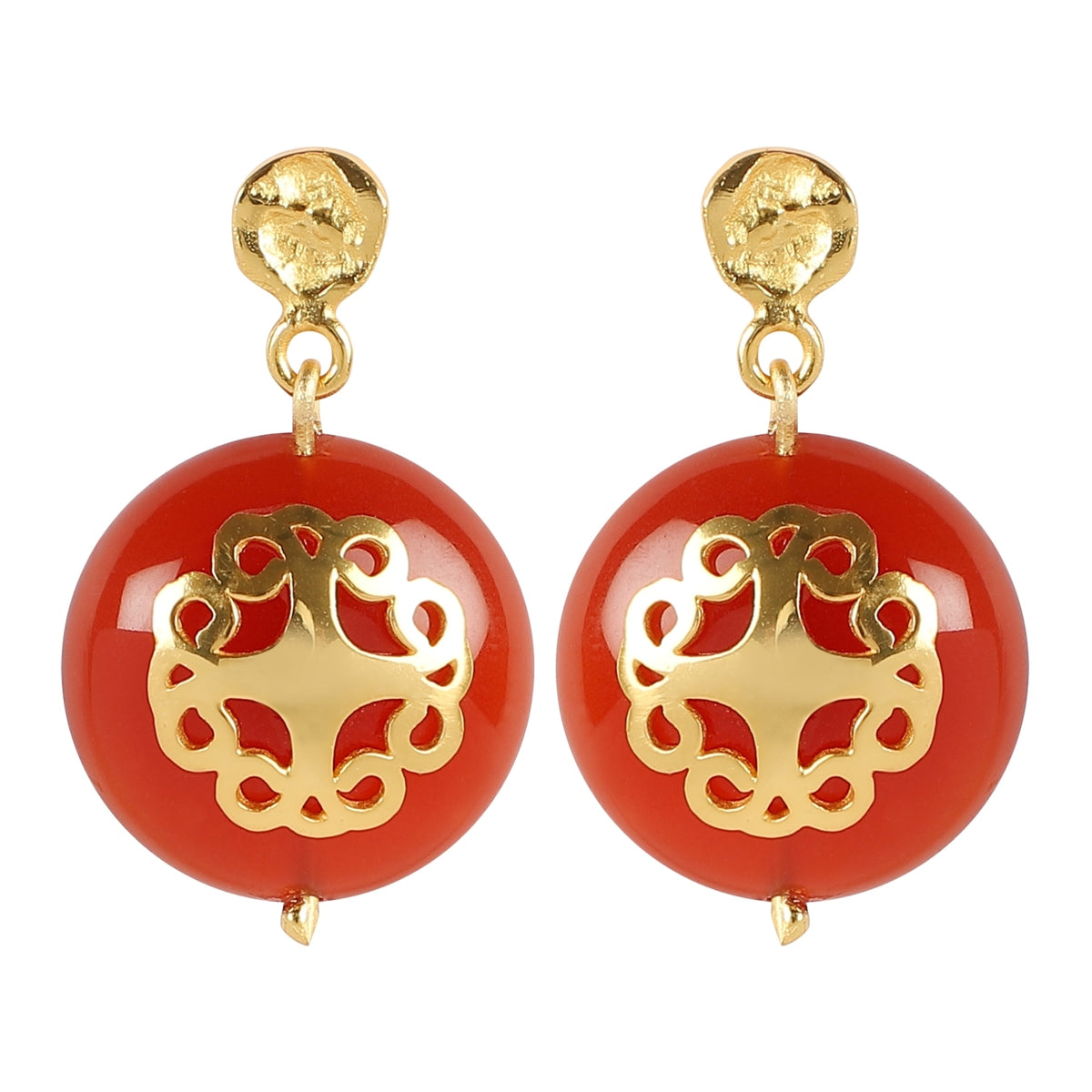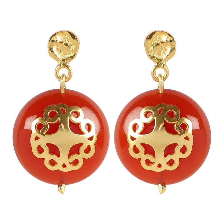 The Red Carnelian Bracelet Melange by Lila Rasa is a beautiful and sophisticated piece. It features intricate, tactile metallic gold-plated brass floral medallions on a vibrant backdrop, adorned with semi-precious carnelian stones. This handcrafted bracelet showcases impeccable artistry and combines a striking design with timeless style.