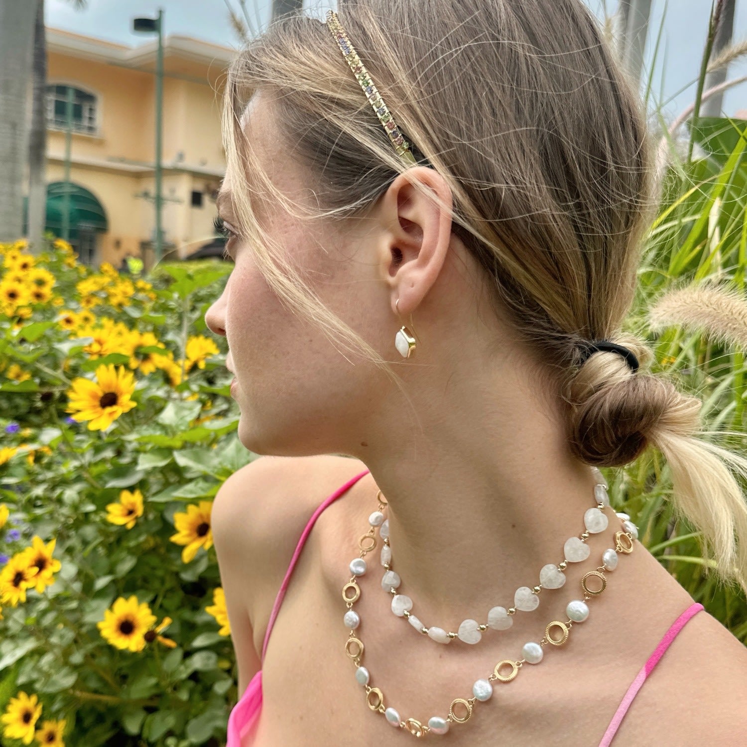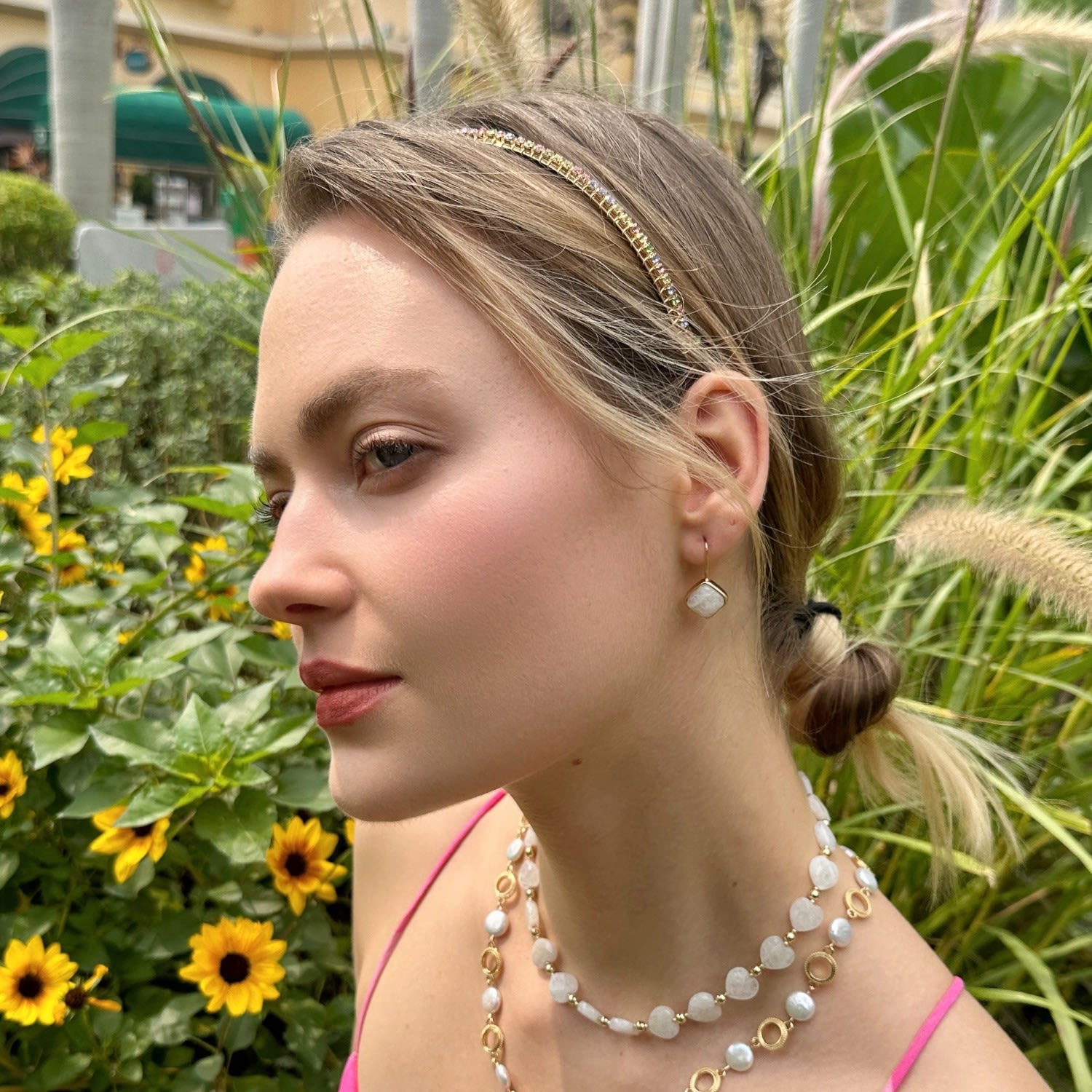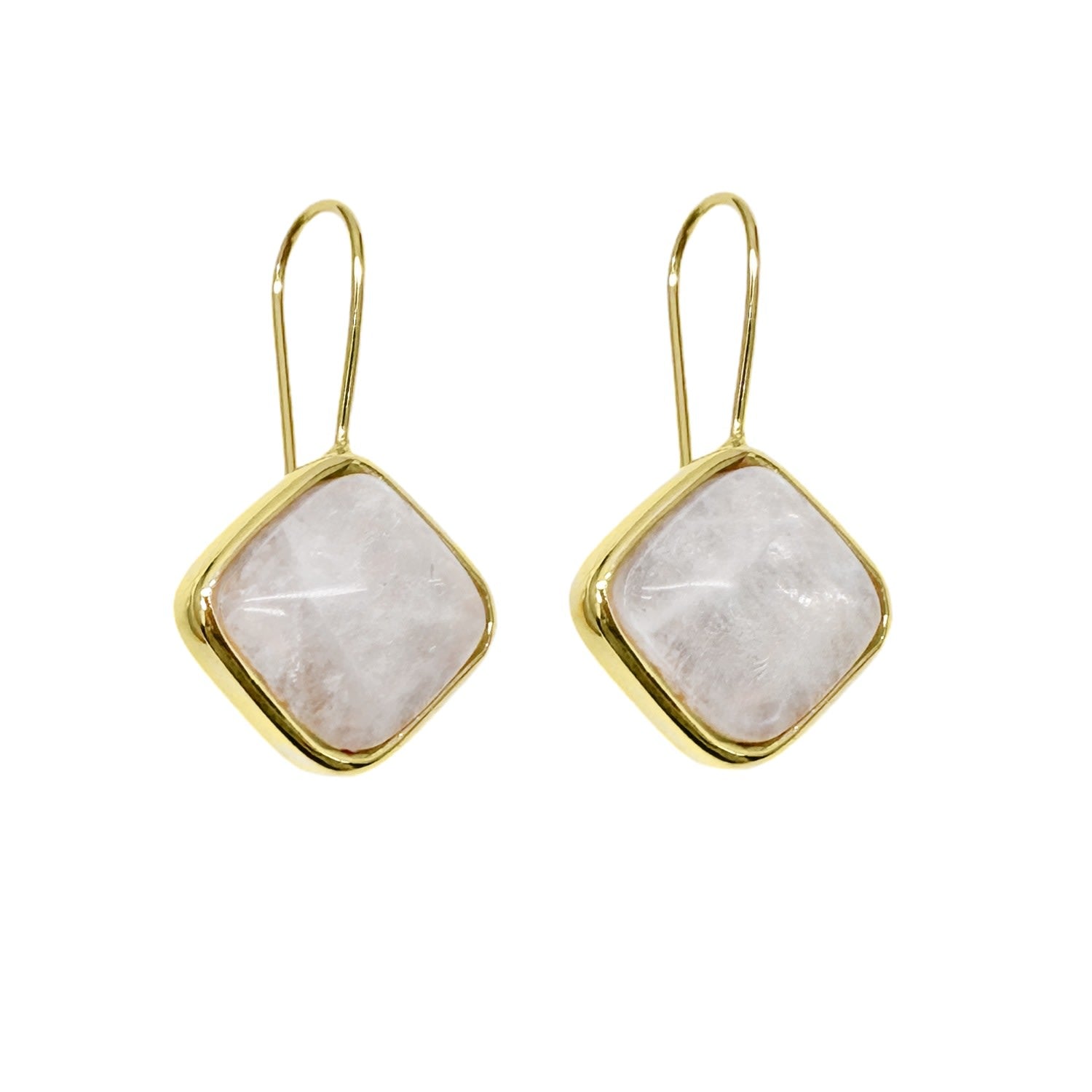 These hook earrings are made of 14K gold-plated brass and feature natural moonstone in a minimalist square shape.