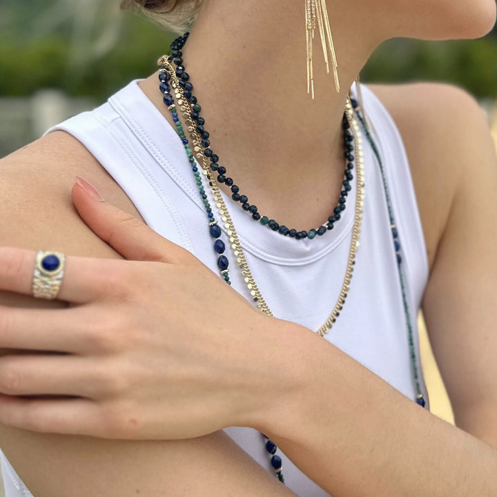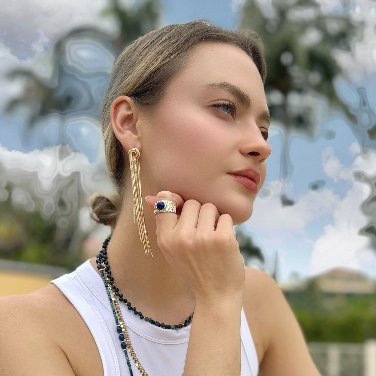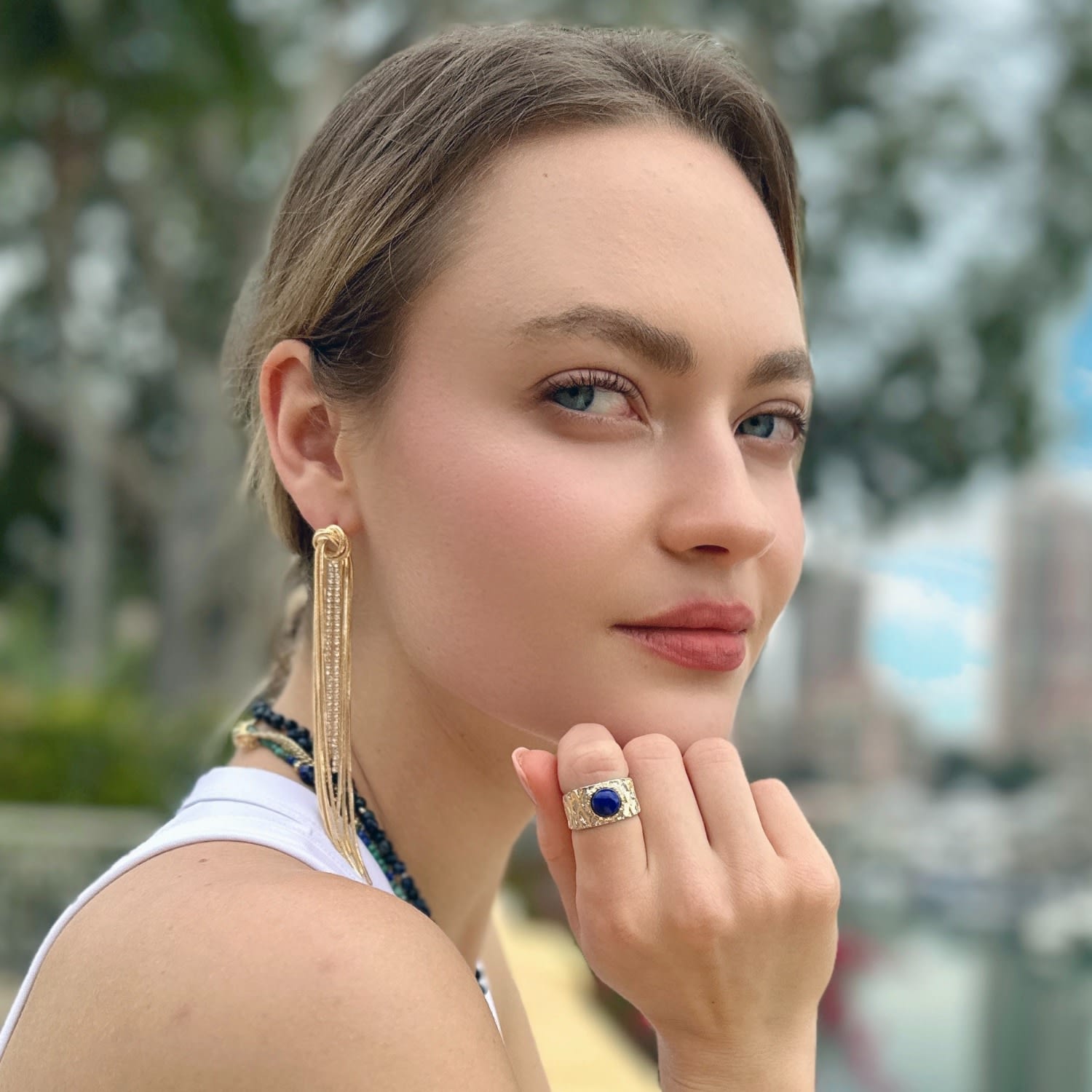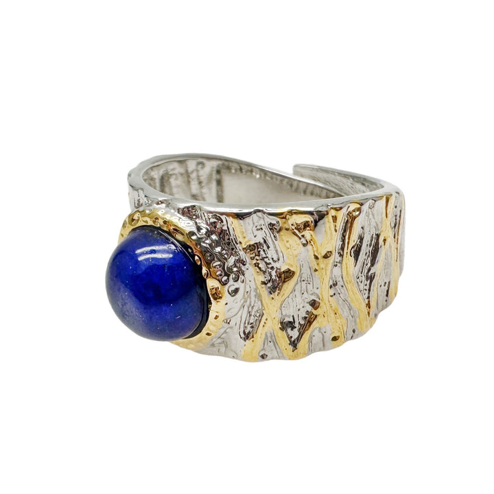 This adjustable ring is made of platinum-plated brass and features a natural lapis lazuli stone.