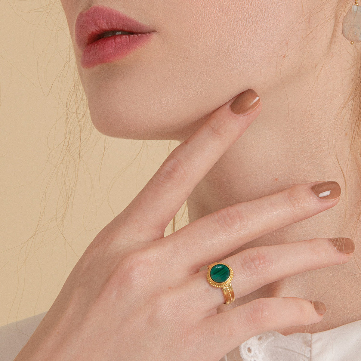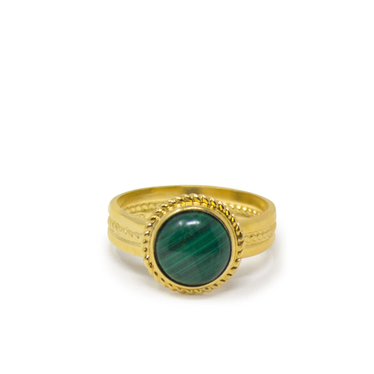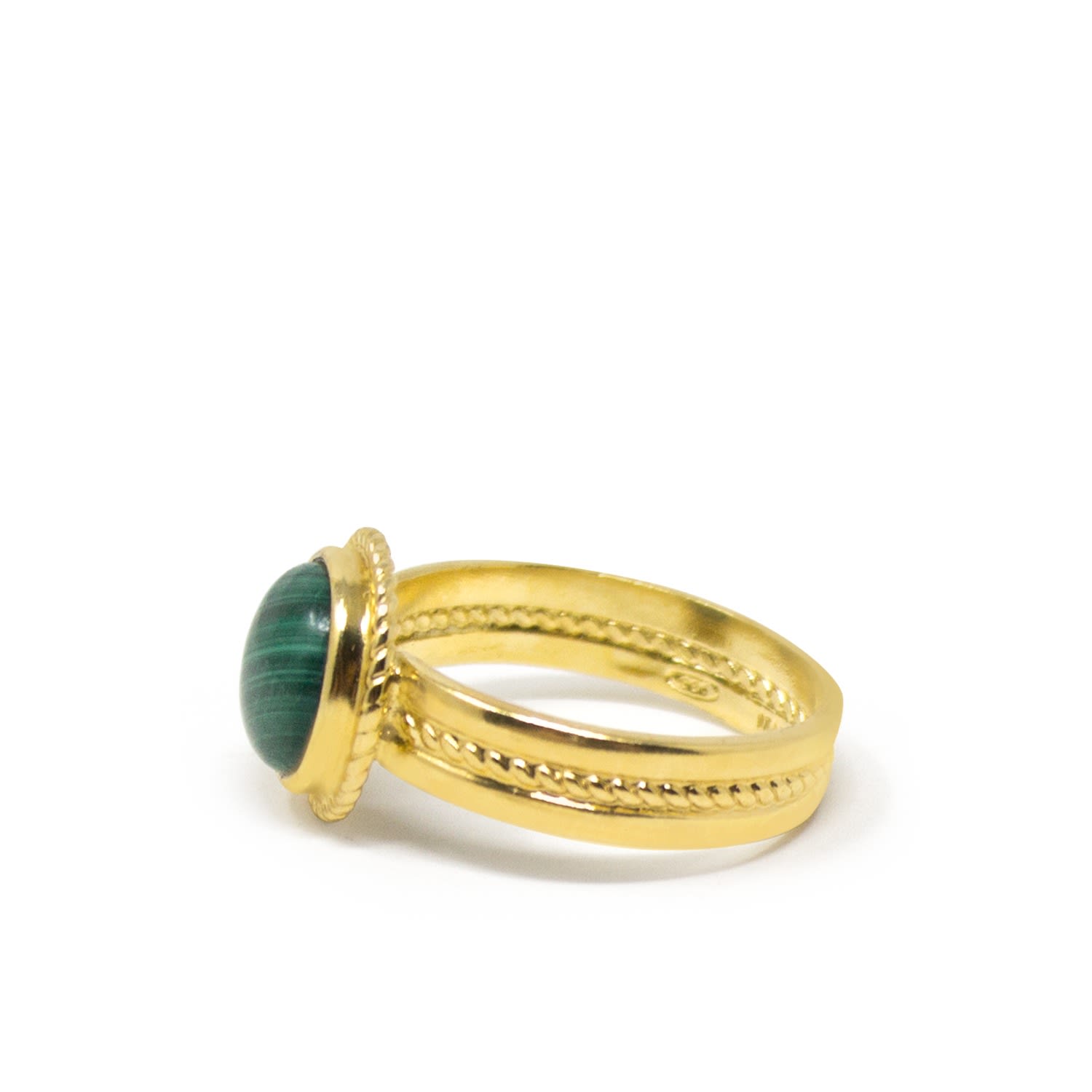 This ring is handcrafted from 18-karat gold-plated silver (1 micron thickness) and features a marbled malachite stone. A 0.10 micron palladium plate is applied before the gold-plating process.