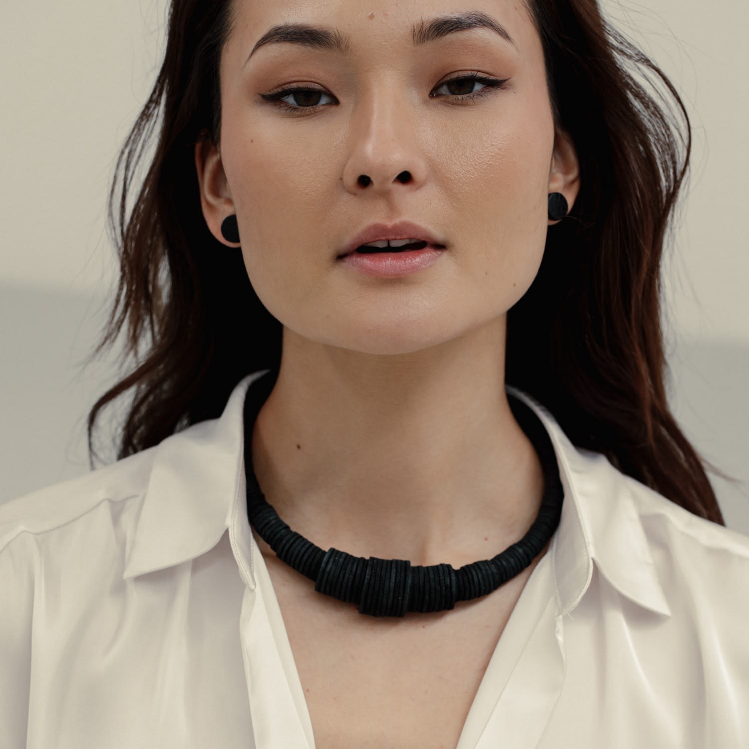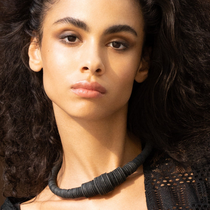 The Gradient Leather Choker by Waiwai is a minimalist and dynamic accessory. This statement choker is made from individually punched genuine leather sequins and stainless steel memory wire. It has a soft feel and is very comfortable and lightweight. The choker has no clasp and flexes easily to put on and adjust to neck size. The unique gradient design is perfect for an effortlessly put-together look.