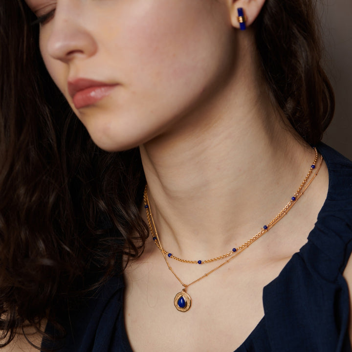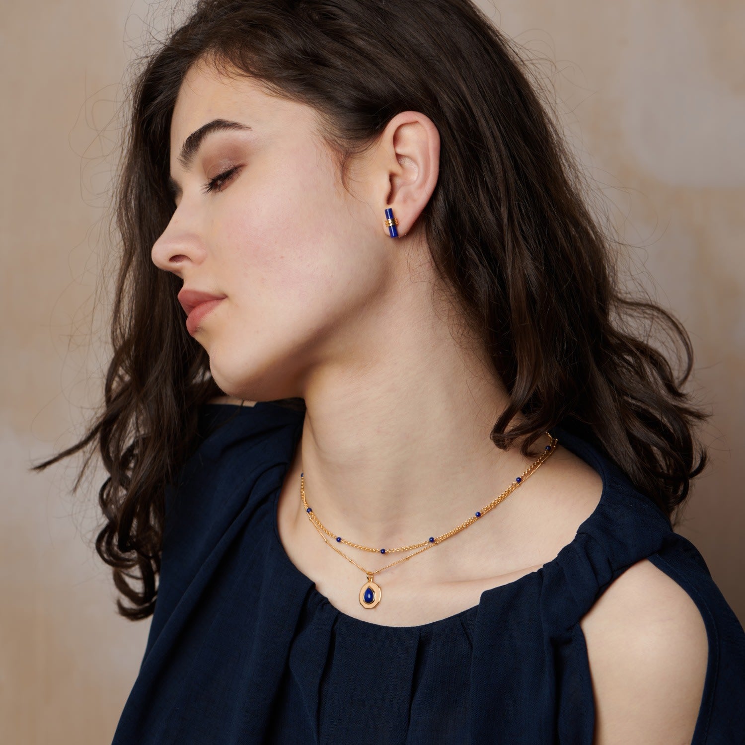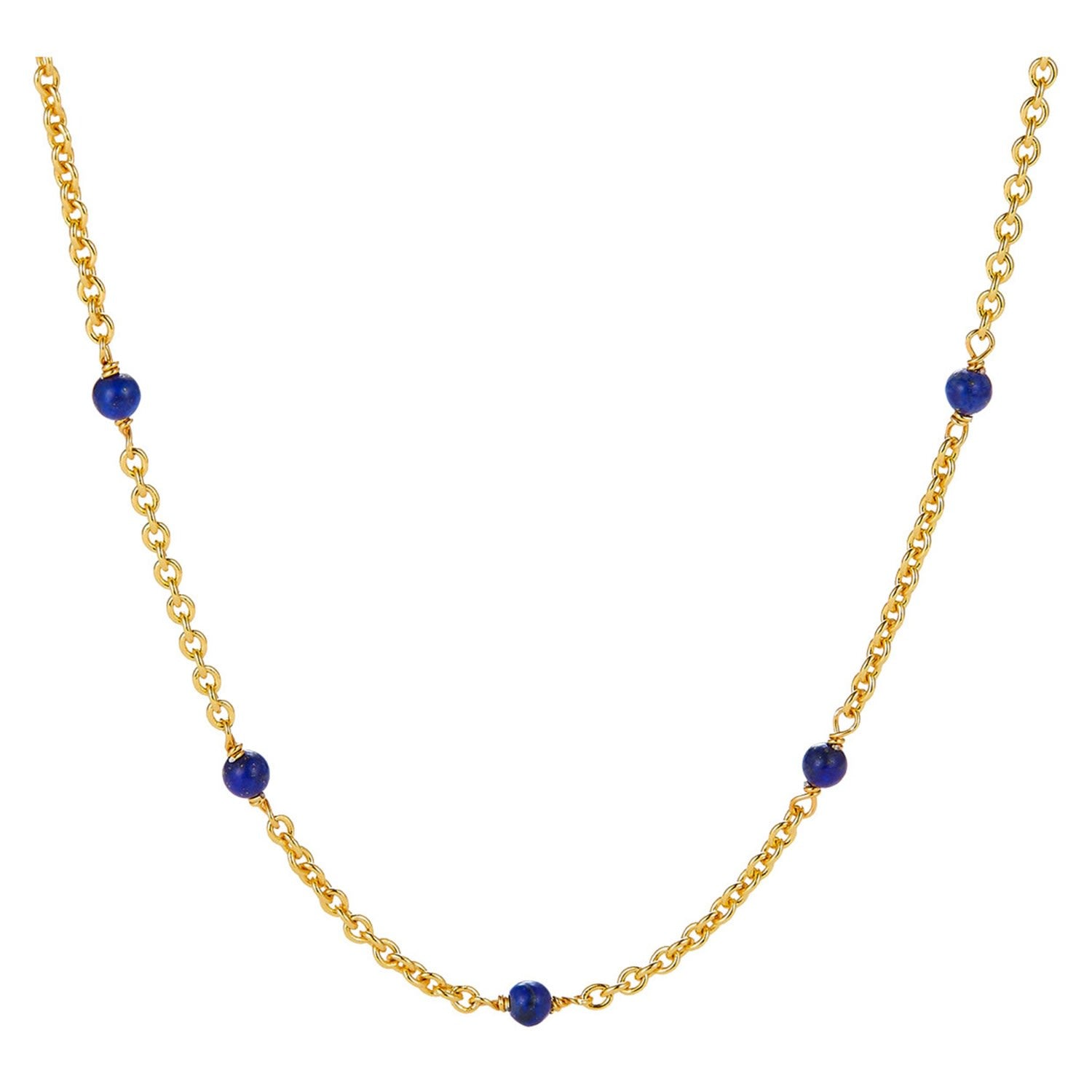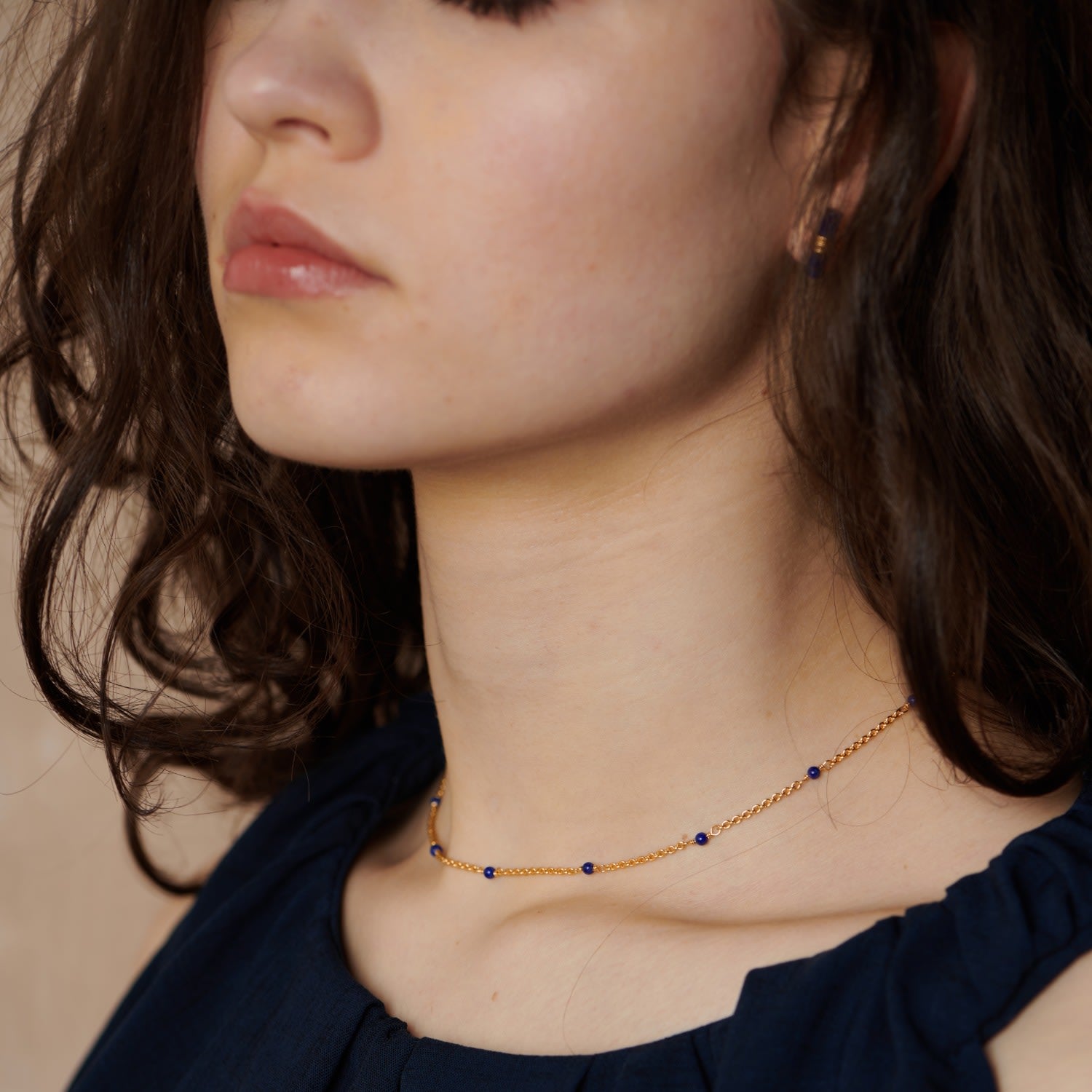 This necklace is crafted from gold vermeil (gold-plated silver) and features lapis lazuli beads on a short chain.