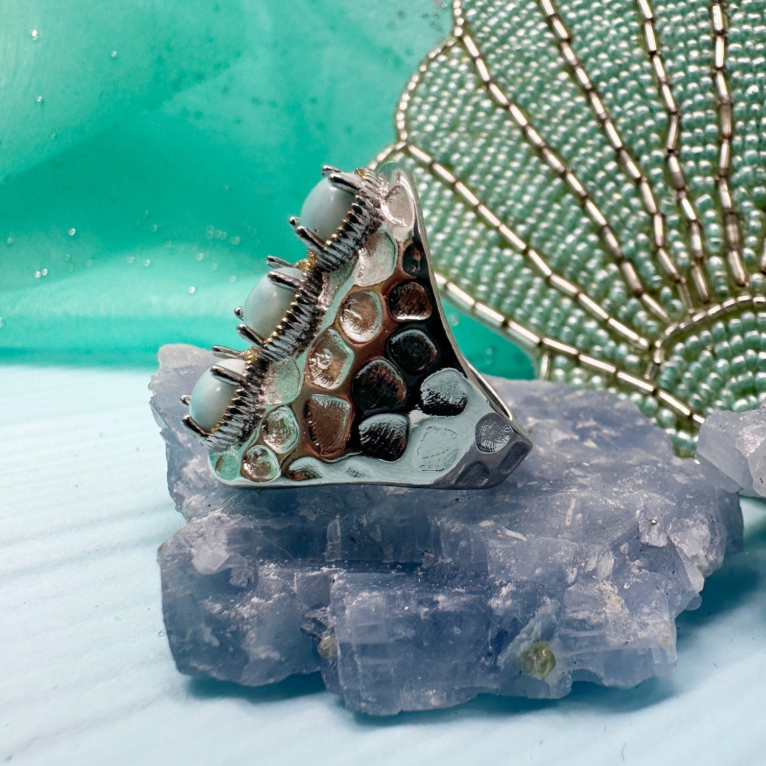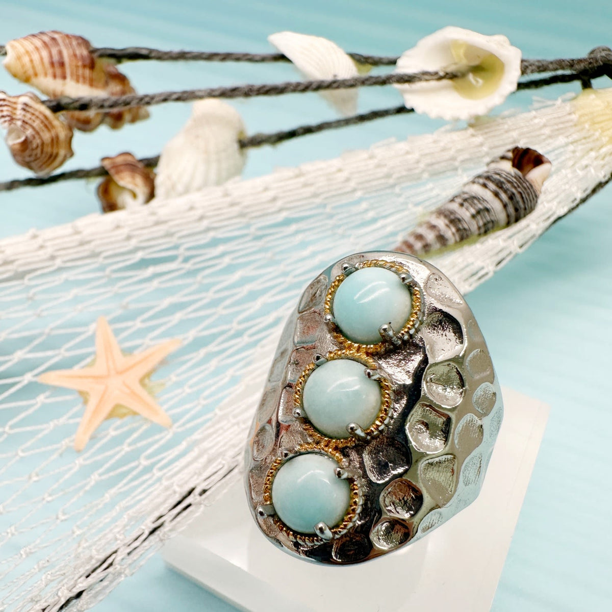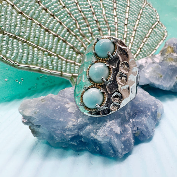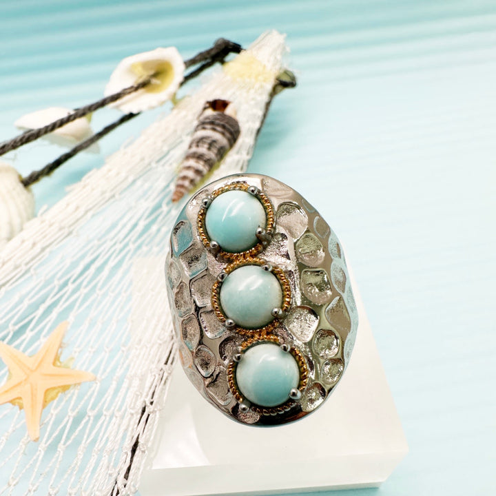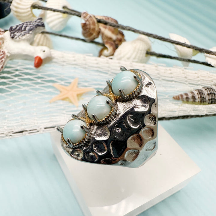 This adjustable ring features three genuine turquoise stones and a platinum-plated brass band.