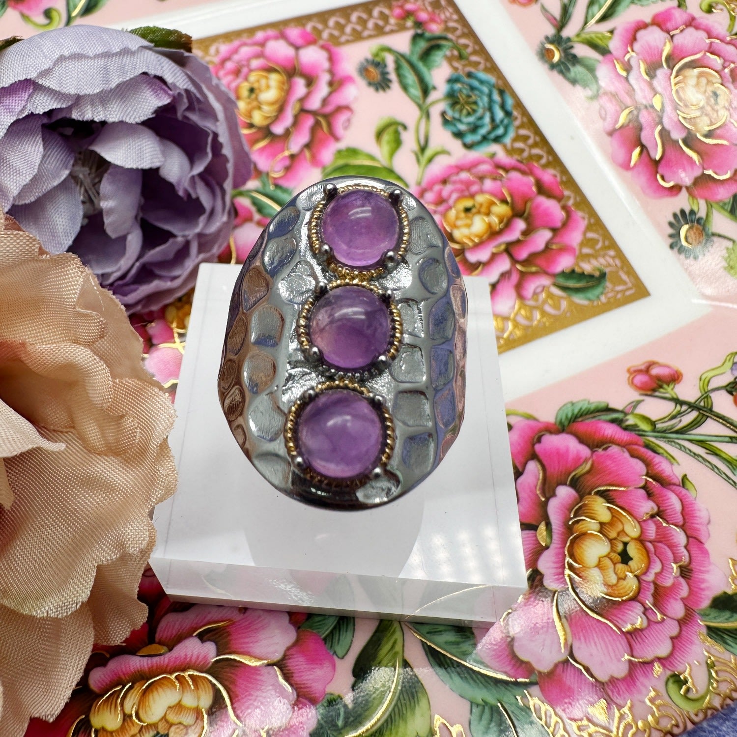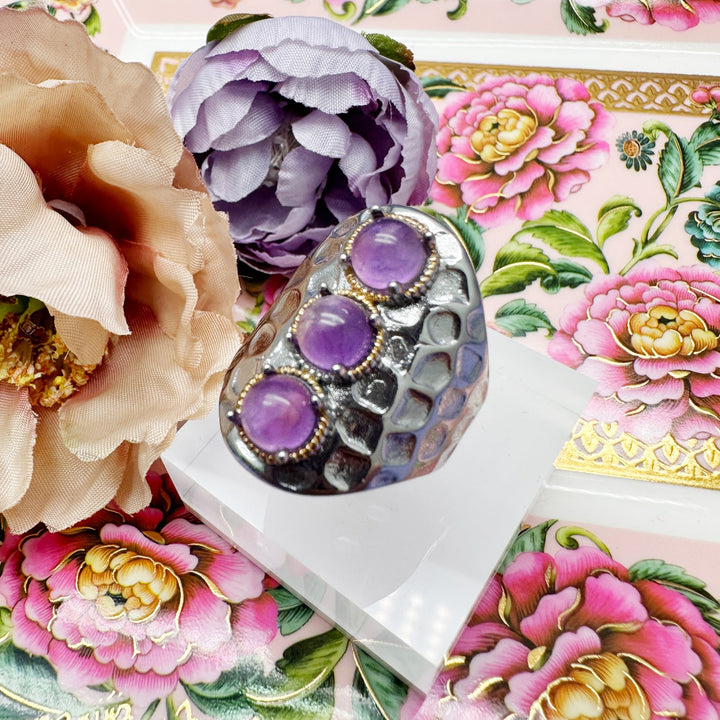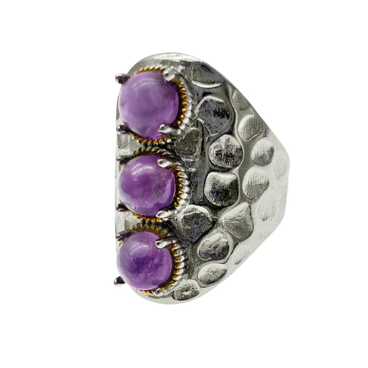This adjustable ring is made of platinum-plated brass and features three genuine amethyst stones in a nugget shape.
