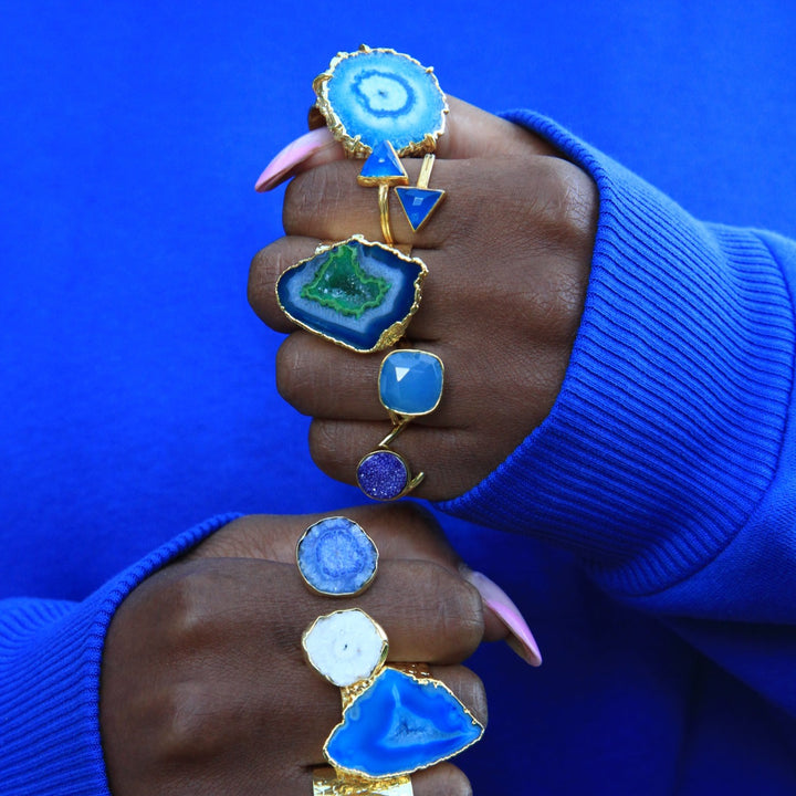 This Blue Ebien Gemstone Gold Adjustable Ring by Yaa Yaa London is a limited-edition piece with vibrant blue stones. Each handmade ring features two beautifully cut chalcedony gemstones on an 18k gold-plated sterling silver base. The rings are comfortable for everyday wear and can be styled alone or stacked. "Ebien" means "two" in Ghanaian, adding a unique cultural touch.