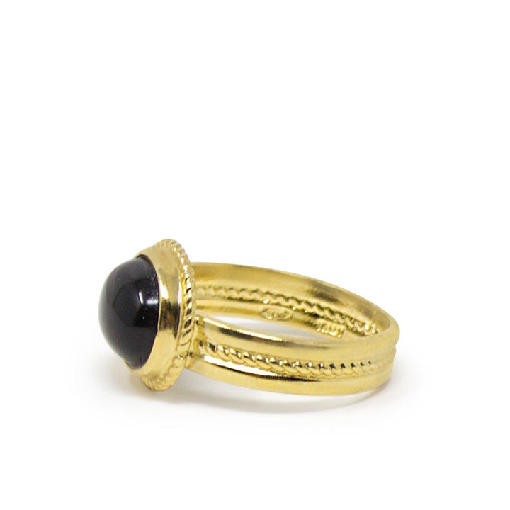 This Fascetta Gold-Plated Mini Onyx Ring by Vintouch Italy is inspired by the Greco-Roman era. Handmade from 18-karat gold-plated silver, this ring from the 'Roma' collection features a perfectly bezel-set polished black onyx stone. The gold-plating is protected by a palladium plate, an anti-oxidizing precious metal. This ring is a minimalist yet sophisticated piece perfect for everyday wear.