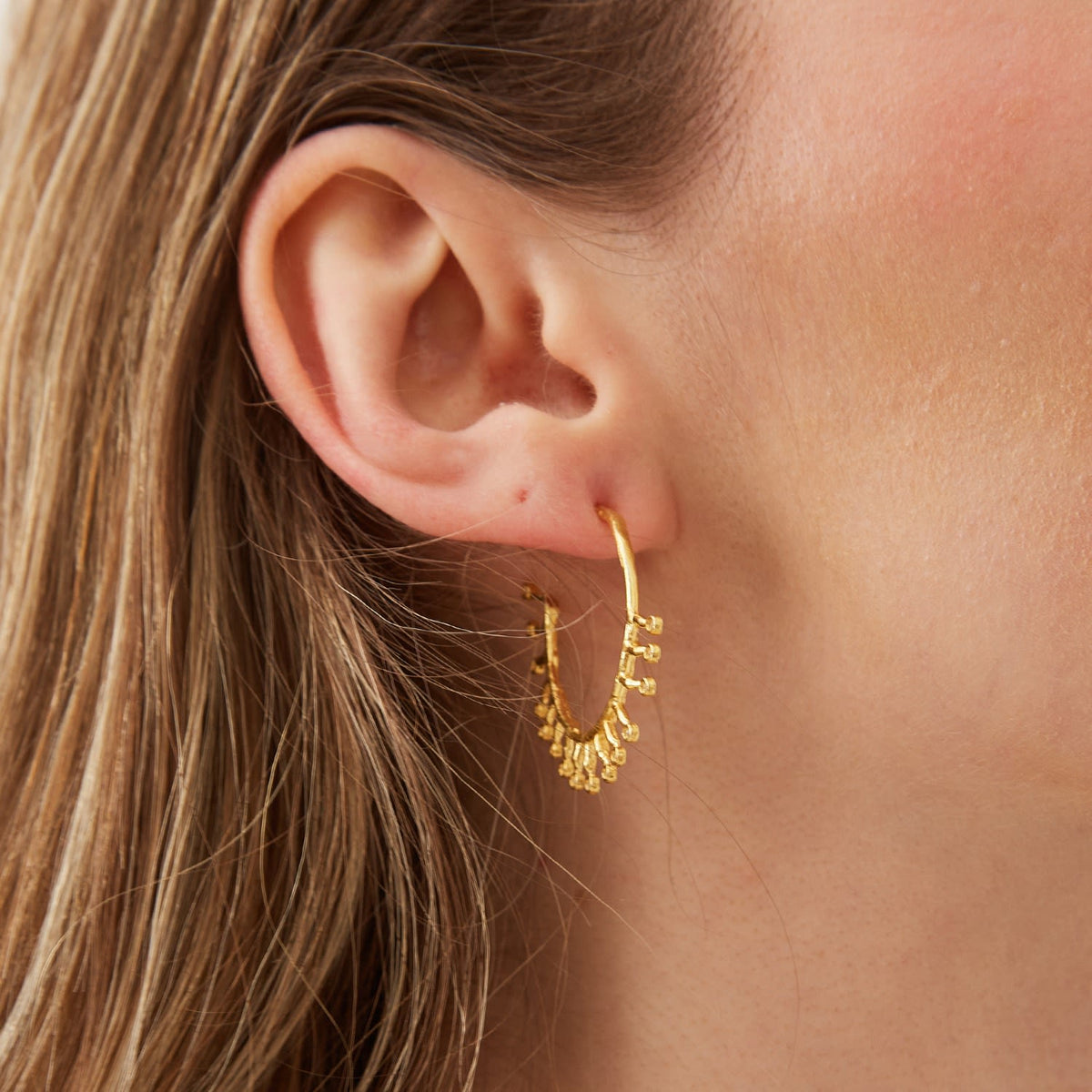 These hoops are crafted from 100% fine sterling silver and are plated with gold. They feature a unique crown design with a natural textured finish.