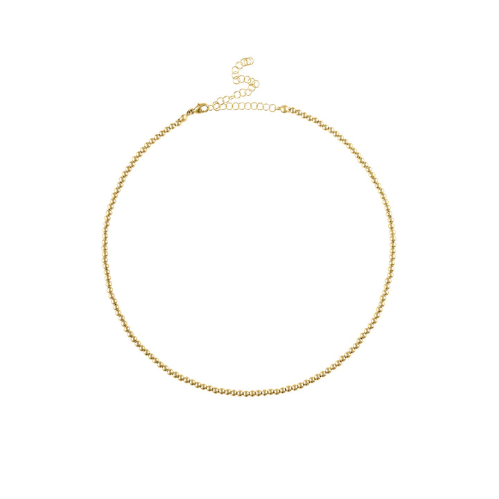This necklace is handmade with 14K gold filled beads (3mm) and has a 14K gold filled lobster clasp and a 3-inch extender. The length is adjustable from 14 inches.