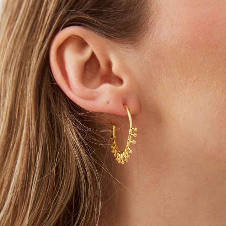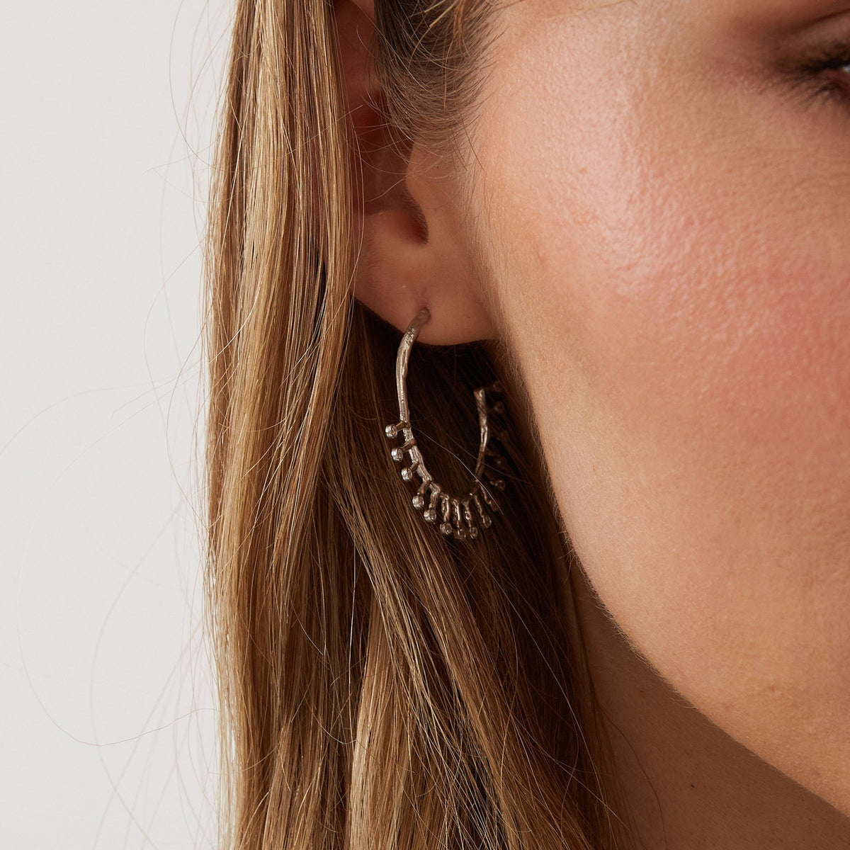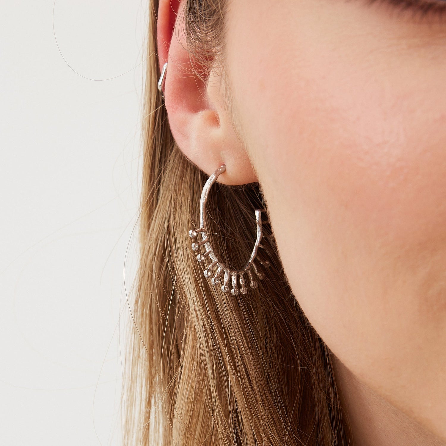 These Sterling Silver Crown Hoop Earrings by Spero London are a modern and elegant accessory that offers a sophisticated twist on a classic design. The unique crown-like shape and natural, molten texture give them a refined and artistic feel. Crafted from luxurious sterling silver, these hoops are a statement piece that adds a touch of radiant style to any look. They are perfect for elevating a casual ensemble or complementing a more formal outfit with their contemporary elegance.
