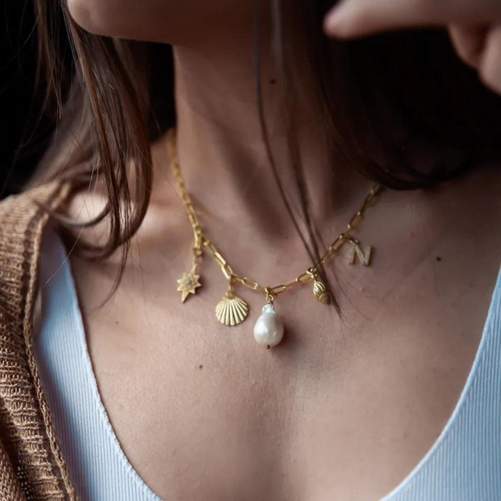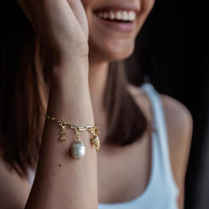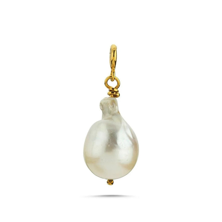 The Baroque Pearl Charm by Linya Jewellery is part of a customizable bracelet design set. The charm features a baroque pearl and is meant to be paired with a chain of your choice to create a unique and personalized bracelet. The charm allows you to express your individual style. The charm is handmade from quality materials.