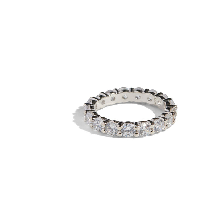 This stacking ring is made from solid sterling silver and is encrusted with cubic zirconia crystals.