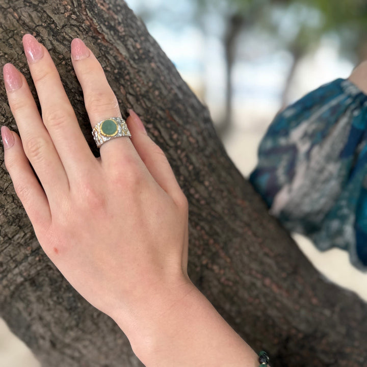 This adjustable ring is crafted from high-quality brass plated with platinum and 14k gold. It features a single, unpolished, natural aventurine stone.