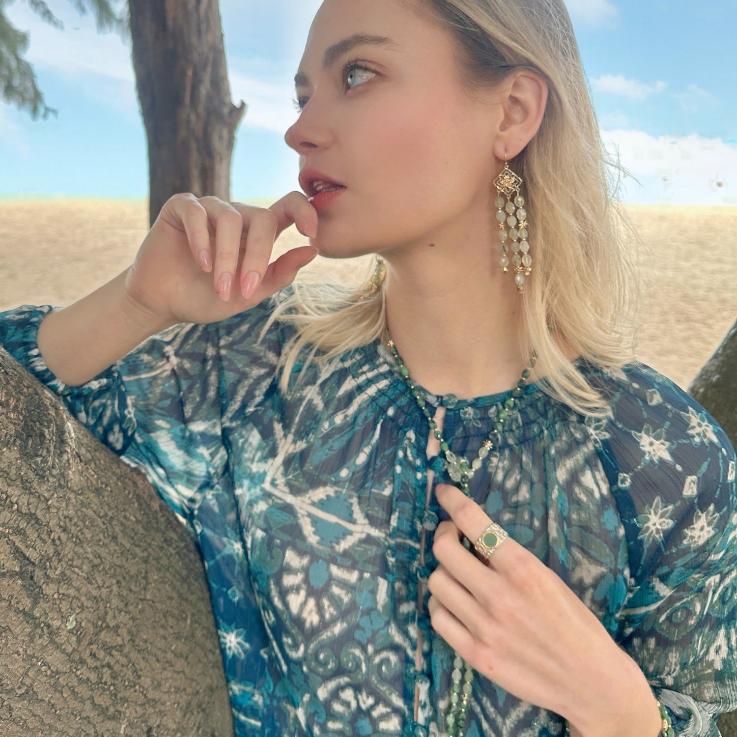 This Aventurine Stone Platinum Plated Brass Adjustable Ring by Farra is an elegant and earthy piece that celebrates natural, organic beauty. The ring features a single, unpolished aventurine stone that showcases its unique texture and intricate patterns. The adjustable band, crafted from high-quality platinum-plated brass, provides a sleek, lustrous finish that beautifully complements the earthy tones of the stone. This ring is a statement of confident, natural style, perfect for those who appreciate the raw, untouched beauty of gemstones.