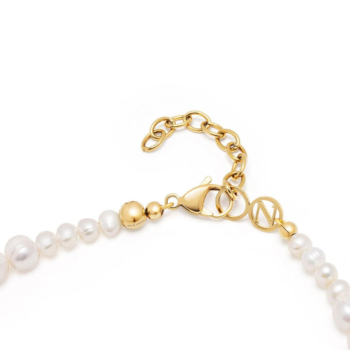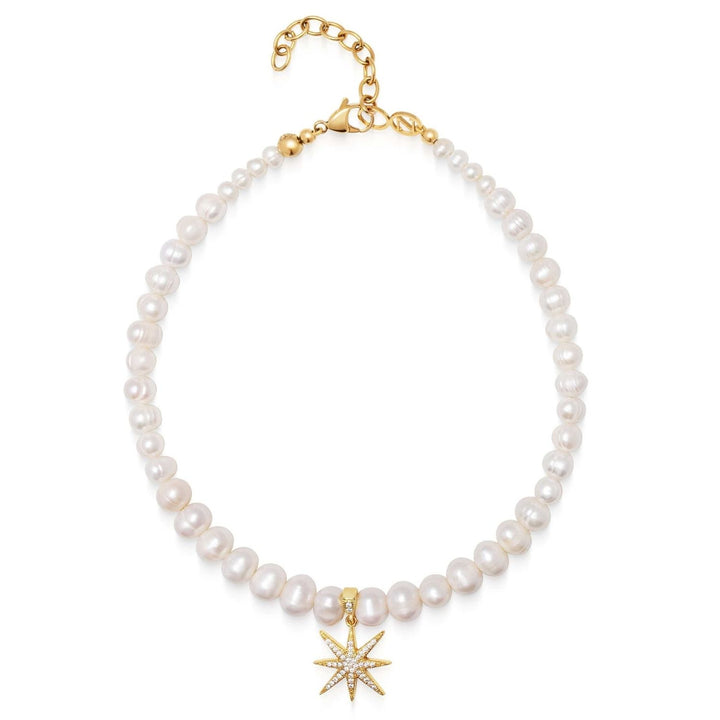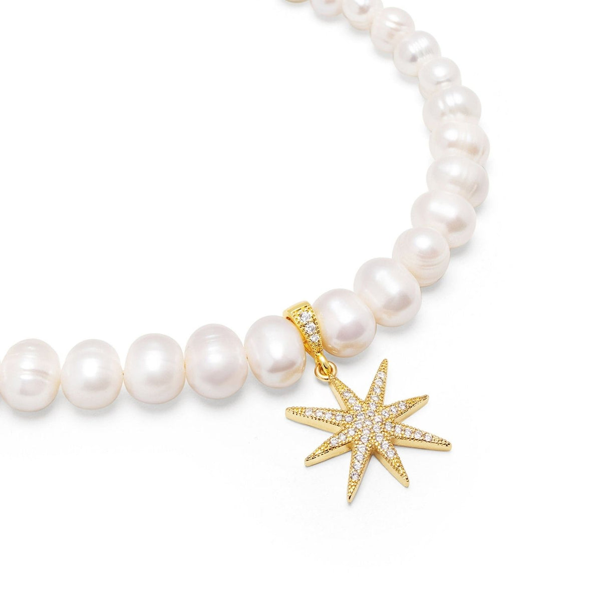 The Women's Twilight Star Pearl Choker by Nialaya is a perfect fusion of classic and modern elegance. This choker features lustrous cultured pearls and a radiant gold star pendant adorned with sparkling cubic zirconia stones. The lock is 18K gold plated stainless steel and the pendant is brass. The celestial-inspired design elevates any outfit with a touch of bold sophistication.