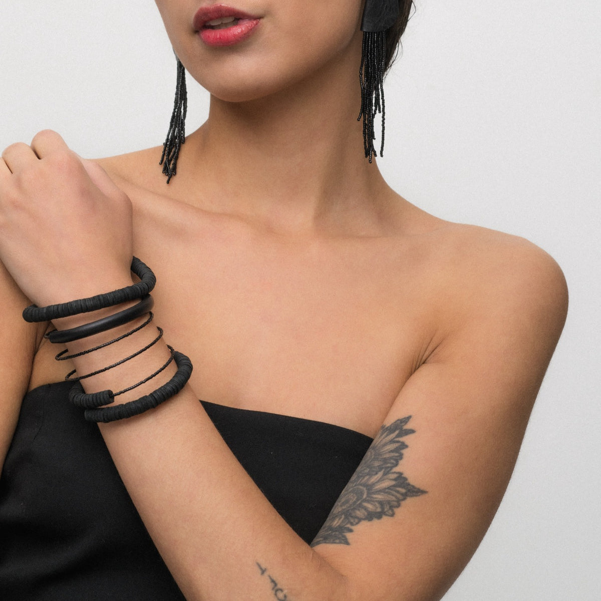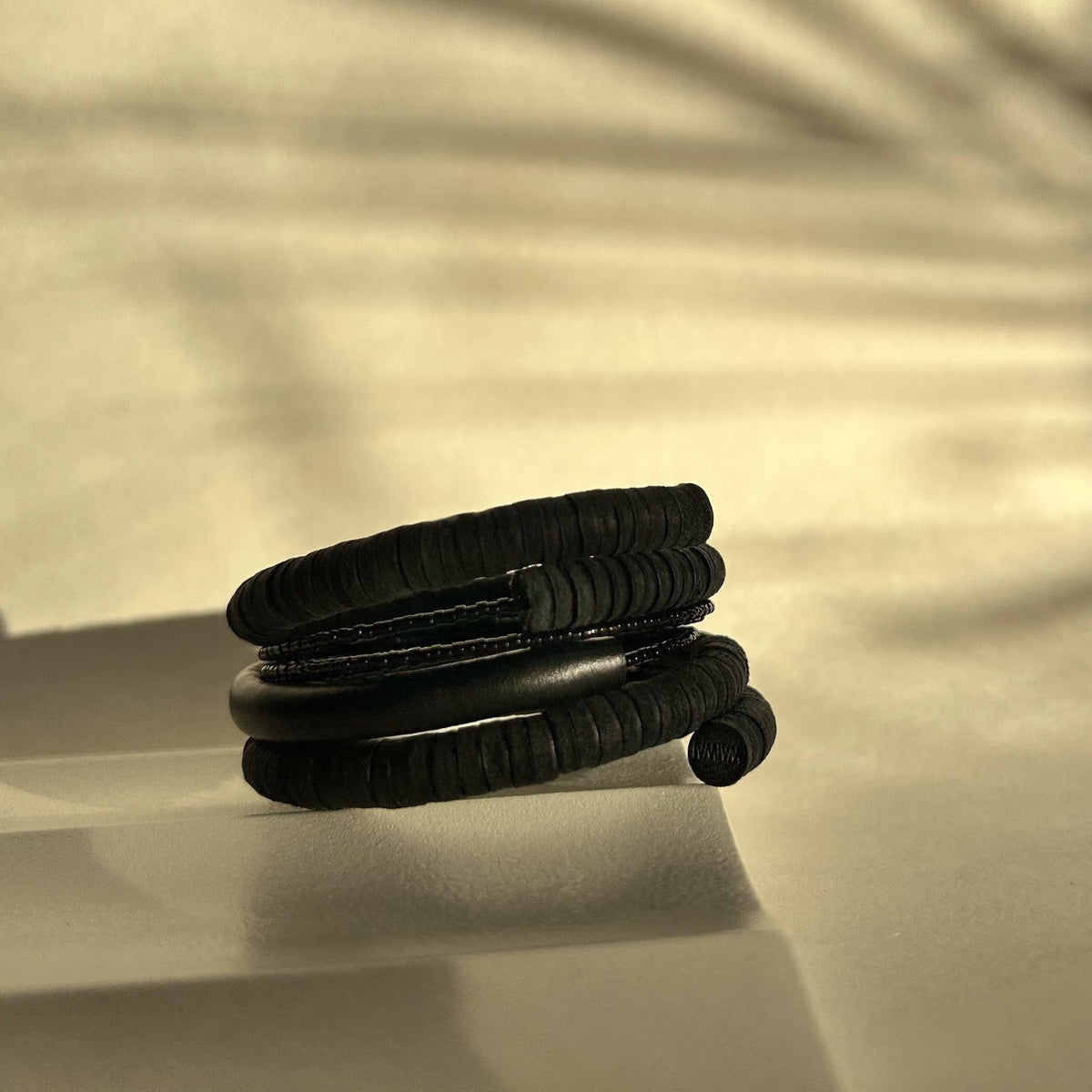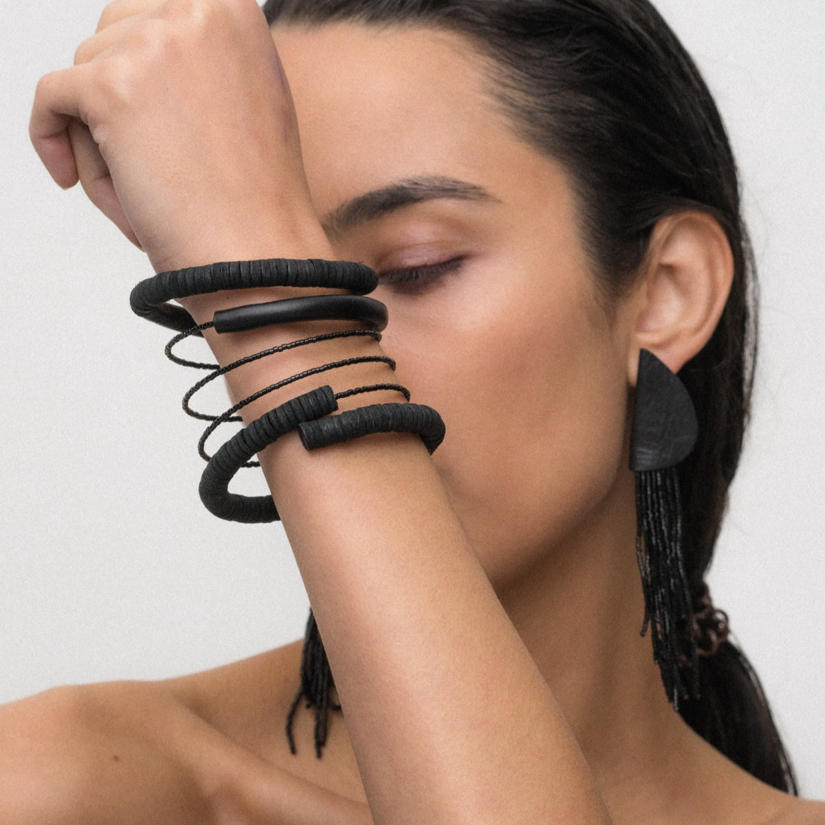 This Eclipse Cuff Beaded Leather Bracelet by Waiwai is a bold, handcrafted statement piece that blends modern design with rich, textured materials. The layered, wraparound design features individually hand-punched black leather discs, a sleek hand-stitched leather tube, and delicate black Japanese glass beads. This meticulous craftsmanship creates a unique, sculptural aesthetic that feels both edgy and refined. This bracelet is designed for those who appreciate a sophisticated, yet powerful accessory that elevates any modern look.
