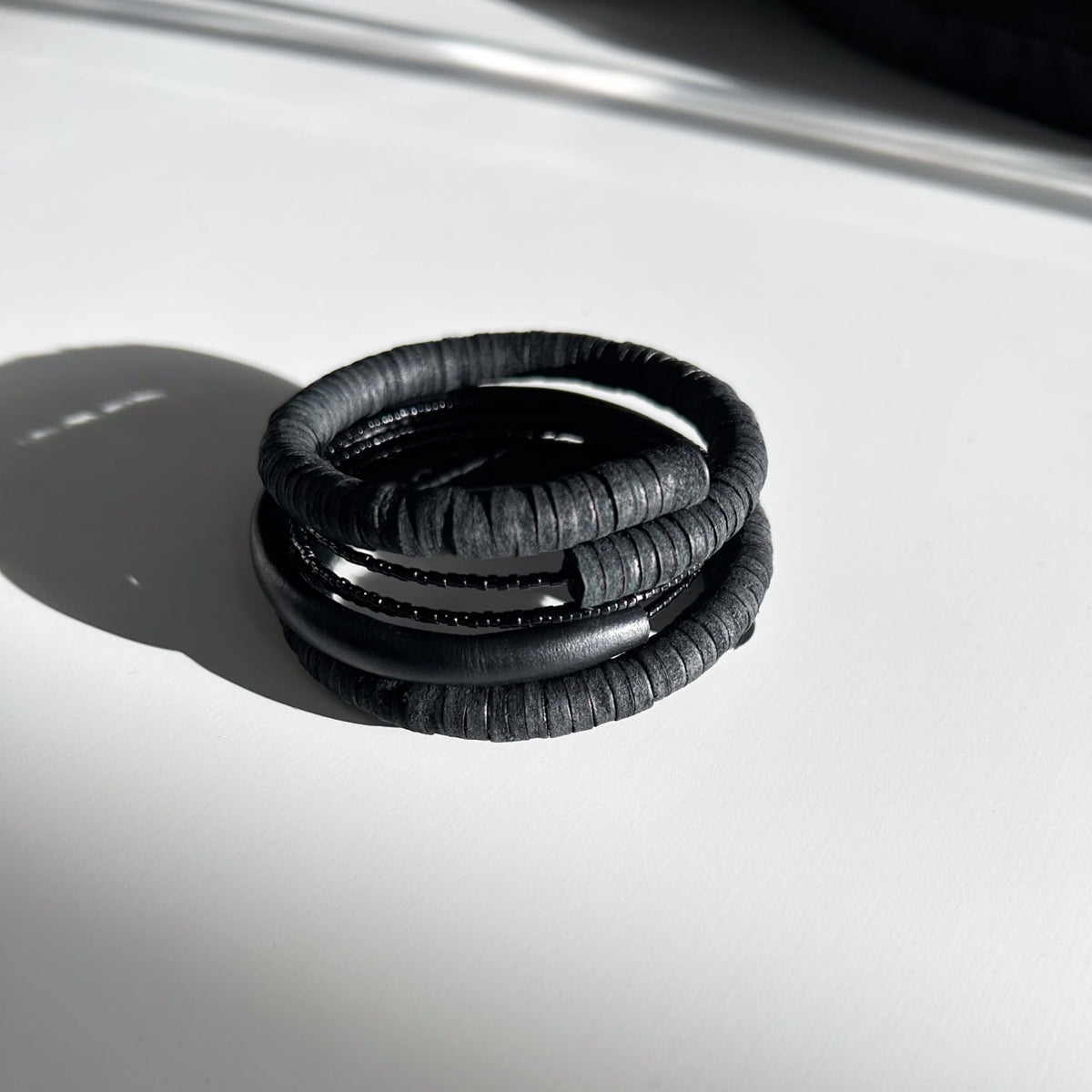 This handcrafted bracelet is made with black leather discs, a hand-stitched leather tube, and black Japanese glass beads.