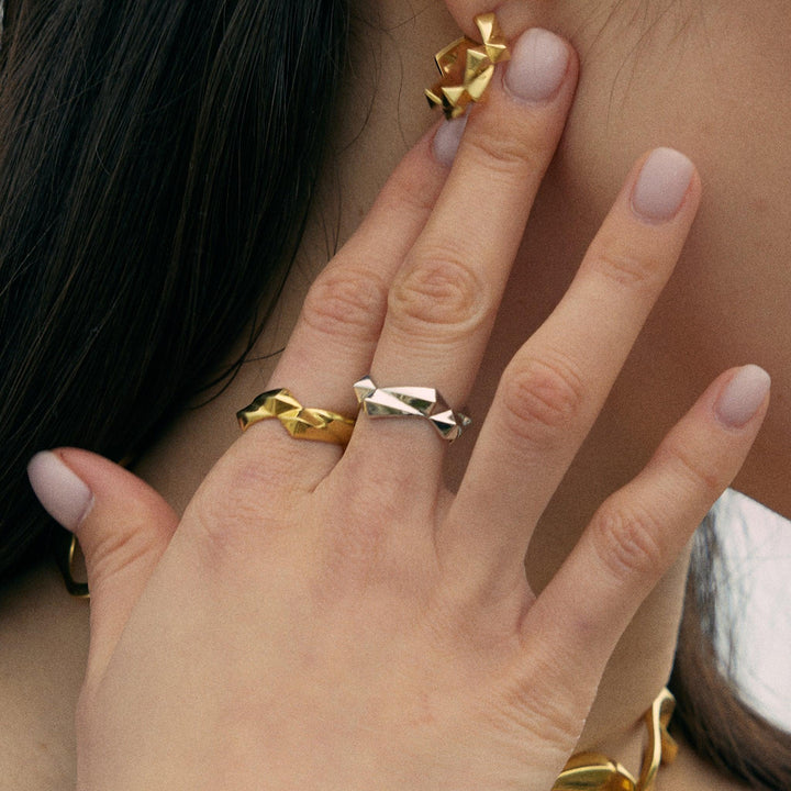 This Brisk Ring Gold by Mishka channels the dynamic energy of the natural world. With a textured surface inspired by wild movements, the ring exudes raw vitality balanced with refined design. Its unisex style makes it versatile, while its bold yet minimal look ensures timeless appeal.
