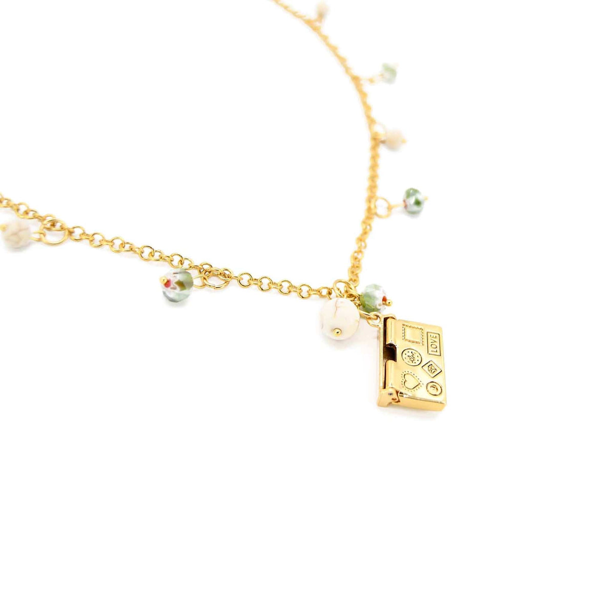 Handmade with 316L stainless steel non-tarnish chain, 18k gold-filled letter pendant, green crystals, and off-white turquoise stones.