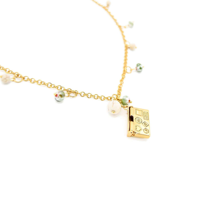 This Love Letter Pendant Handmade Necklace by Adiba is a heartfelt piece that beautifully blends elegance with sentiment. A shimmering gold-filled initial pendant rests against a stainless steel non-tarnish chain, highlighted by calming green crystals and soothing off-white turquoise stones. Symbolic of love, identity, and connection, this necklace makes an enchanting keepsake or thoughtful gift. Each piece is handmade with care, ensuring uniqueness and authenticity.