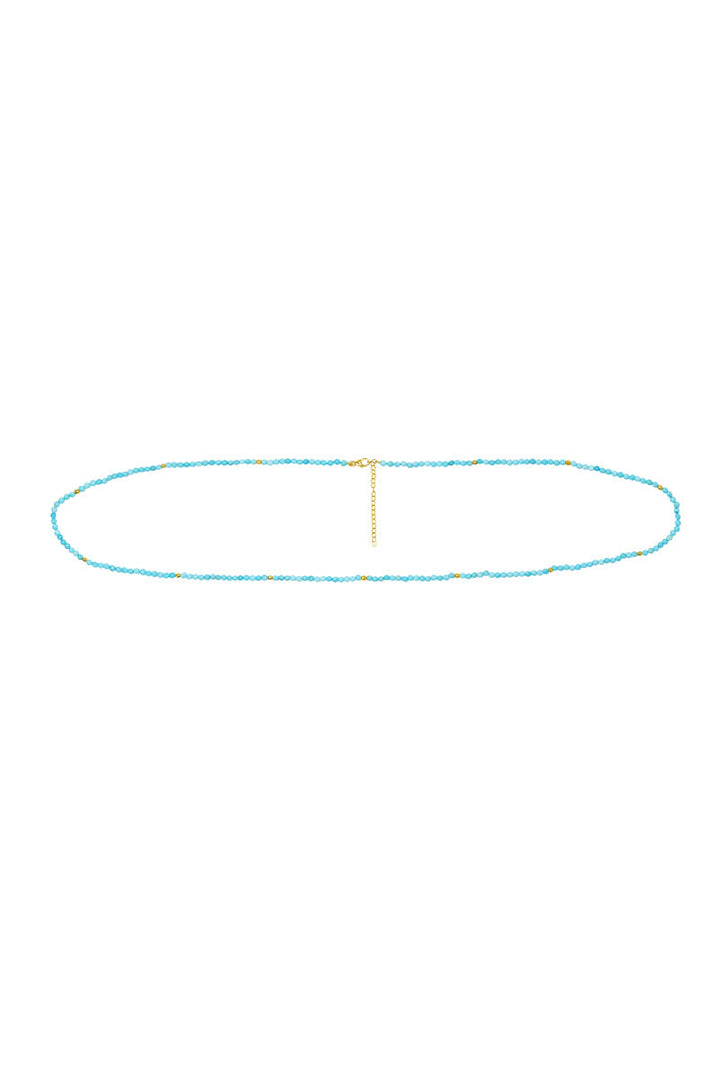 This multi-wear chain is made with 14K gold-filled beads and turquoise. It is water-resistant, tarnish-resistant, and hypoallergenic. It can be worn as a belly chain or necklace.