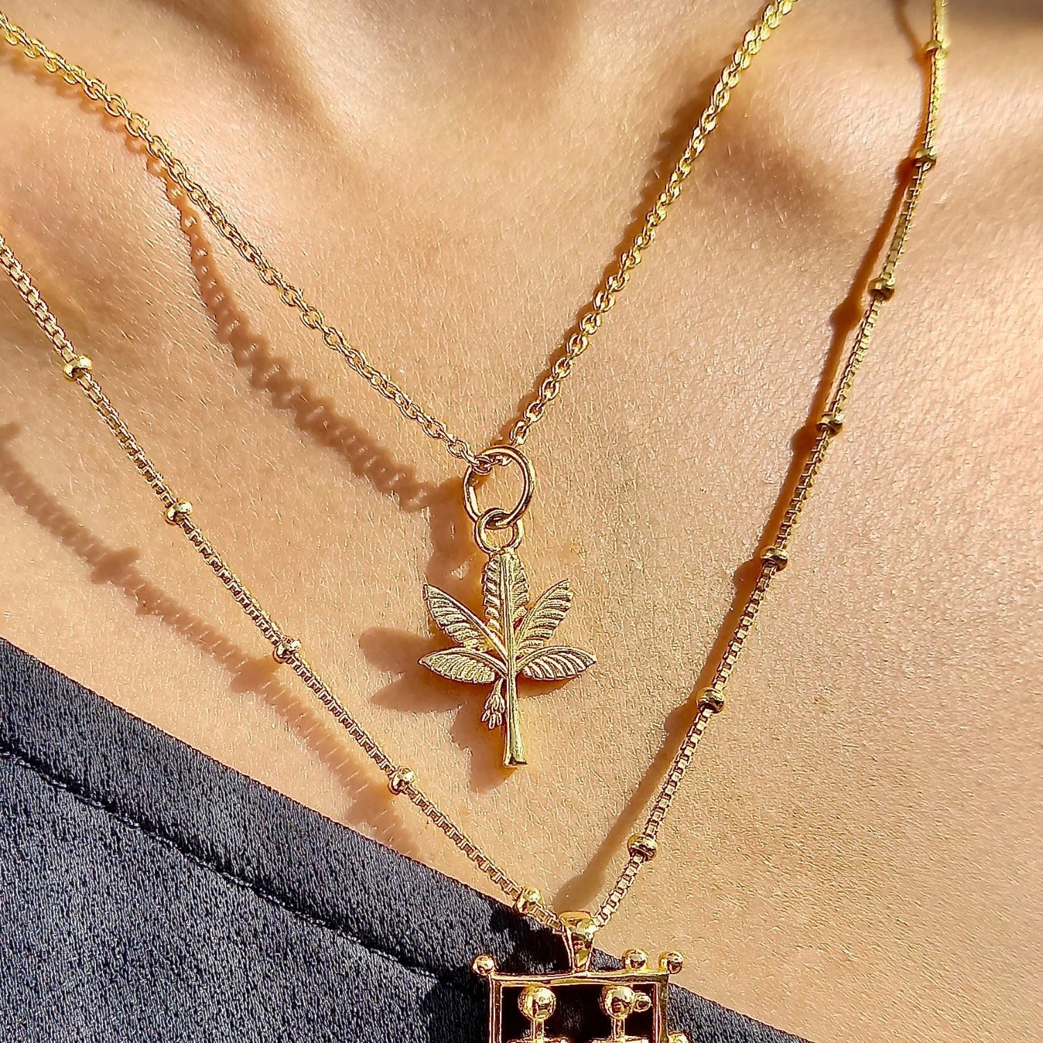This necklace features a banana tree charm. The charm is made from 22K gold vermeil (2.5 microns) on a recycled sterling silver (92.5) base. The piece is handmade by Fairtrade artisans.