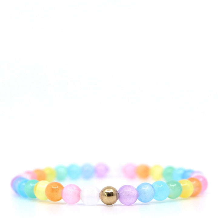 This bracelet is crafted from pastel rainbow selenite beads with a 14-karat gold-filled spacer.