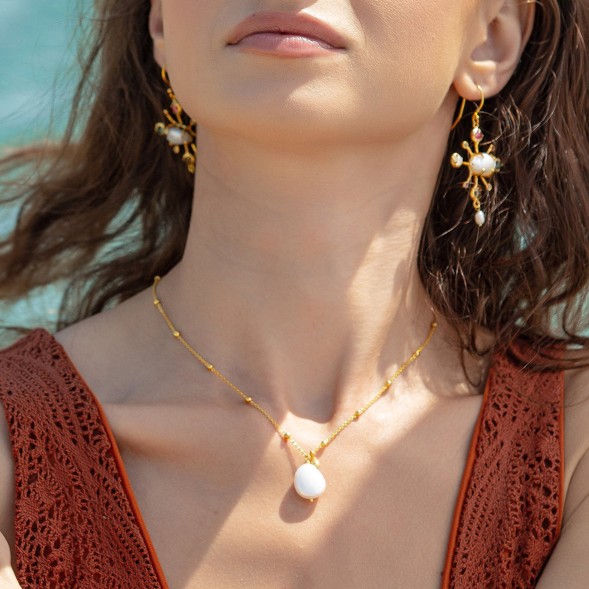 A handcrafted necklace with a unique baroque-shaped keshi pearl set in a silver pendant, finished with a delicate beaded chain.