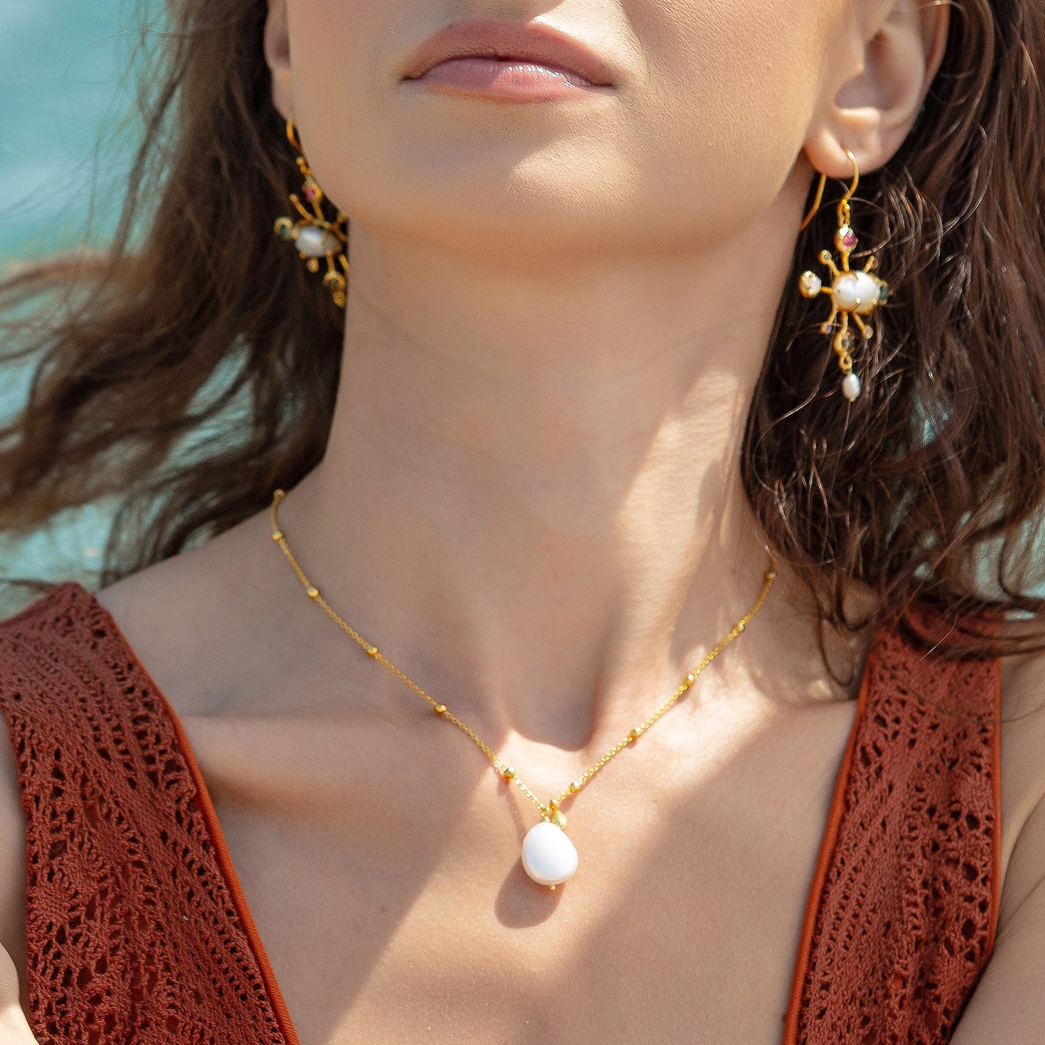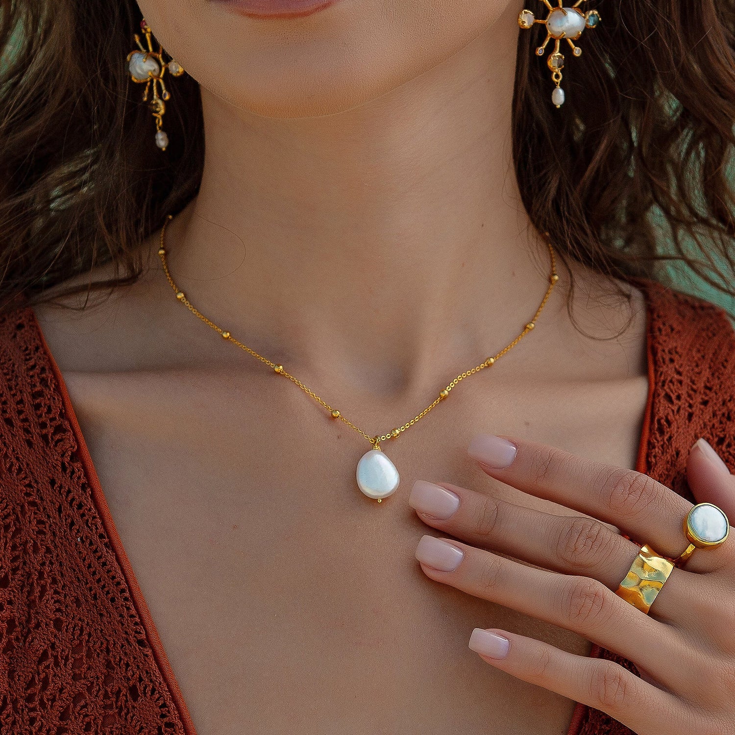 This Baroque Keshi Pearl Gold Pendant Beaded Chain Necklace by Mejoma exudes a timeless and luxurious elegance. The centerpiece is a unique, naturally irregular baroque-shaped keshi pearl, celebrated for its imperfections and set beautifully in a silver pendant. The delicate beaded chain adds a touch of texture and refinement, making it a sophisticated accessory for any outfit. This necklace symbolizes a celebration of natural beauty and individuality, offering a piece of refined art to adorn your neckline.
