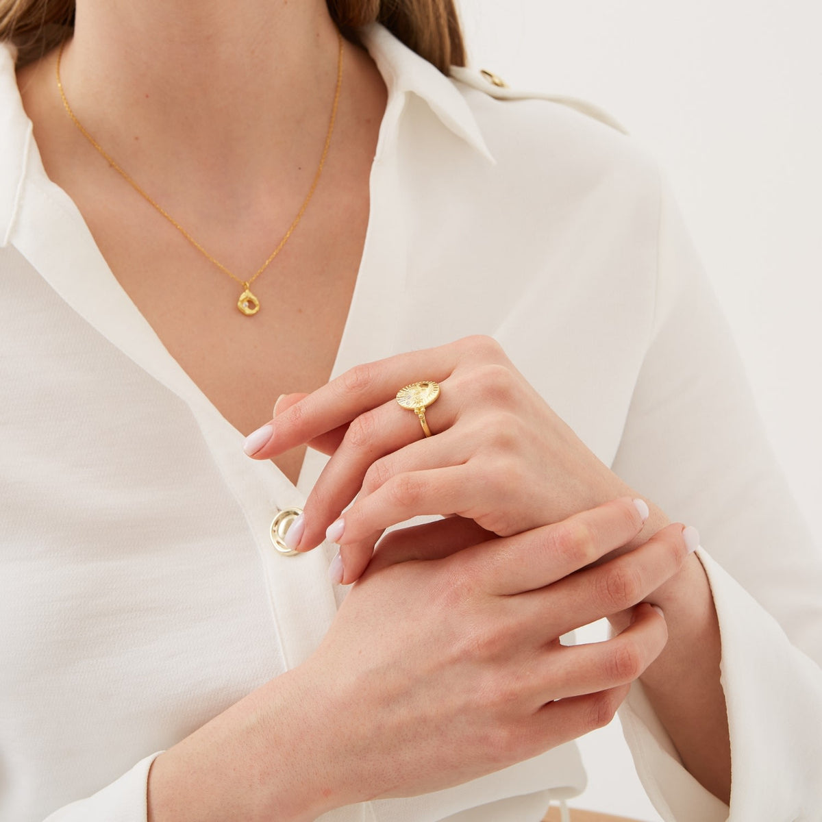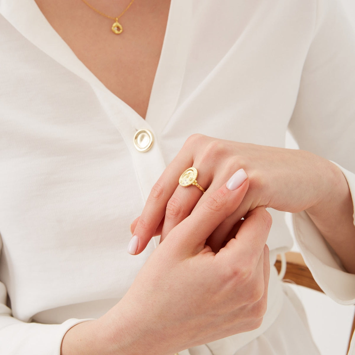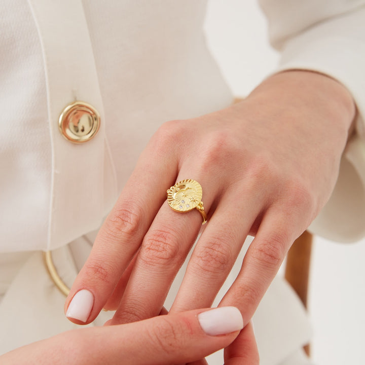 This Moon Face Sterling Silver Ring - Gold by Spero London is a celestial-inspired accessory designed to help you embrace the divine magic within. The adjustable ring features intricate moon details and glistening cubic zirconias, all with a textured and glossy finish. The luxurious gold tone complements any outfit, making it a versatile statement piece that can be worn solo or stacked with other rings to elevate your everyday look. This ring is a perfect token of celestial elegance.