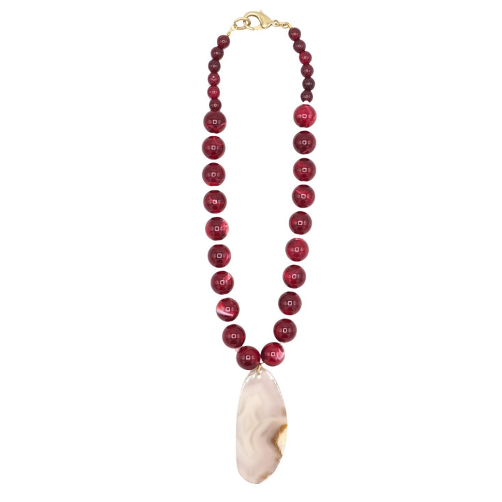 This Cobra Necklace in Dark Red by Sita Nevado makes a bold, artistic statement with large resin beads and a striking natural stone pendant. Its sculptural presence, rich tones, and substantial weight create an avant-garde accessory that pairs perfectly with both minimalist and bohemian styles.