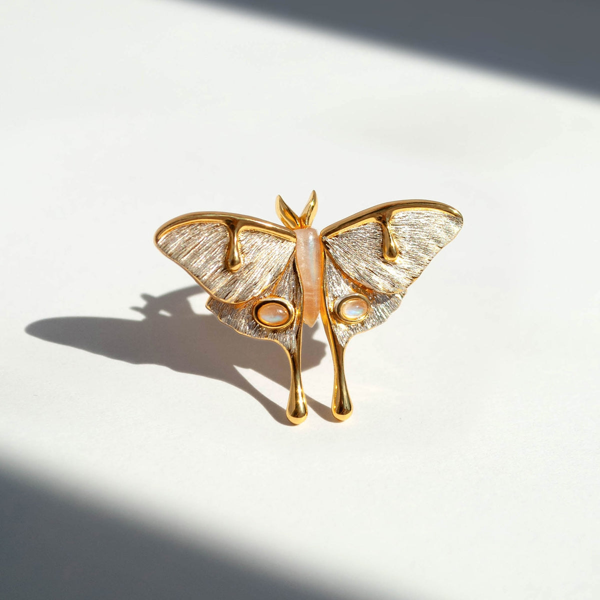 This Lunar Moth Ring by Marie June Jewelry channels mystery and transformation through its enchanting design. The lunar moth, a symbol of rebirth, intuition, and spiritual guidance, is paired with glowing natural moonstones that shimmer with an ethereal play of light. Handcrafted with golden accents, this piece bridges the mystical and the modern, making it a talisman of elegance and renewal. Ideal as a statement ring or as part of a layered jewelry story.