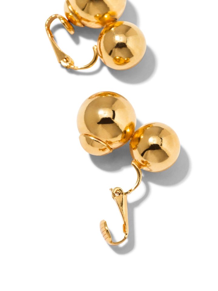 The Gold Uptown Orbita Clip On Earrings by Jaredjamin are a classic and glamorous accessory. These spherical, clip-on earrings are featured here in an 18K Gold plate-over-brass. The pieces are sealed in a "never-tarnish E-coating" and are 3/4 of an inch, making them a vintage-inspired statement piece.