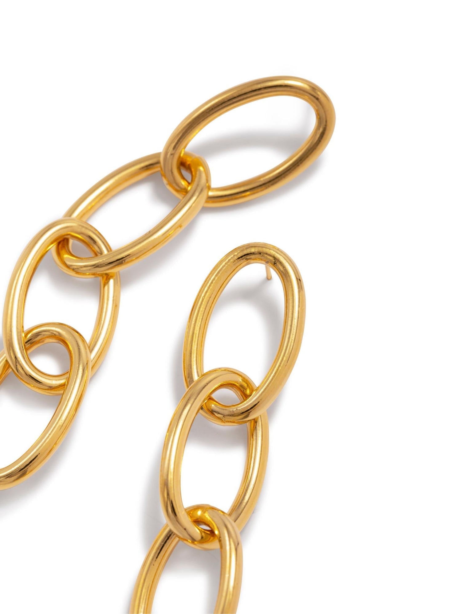These earrings are 18k gold-plated and feature a chain and oval link design. They have a surgical steel post and are 3.75 inches long.