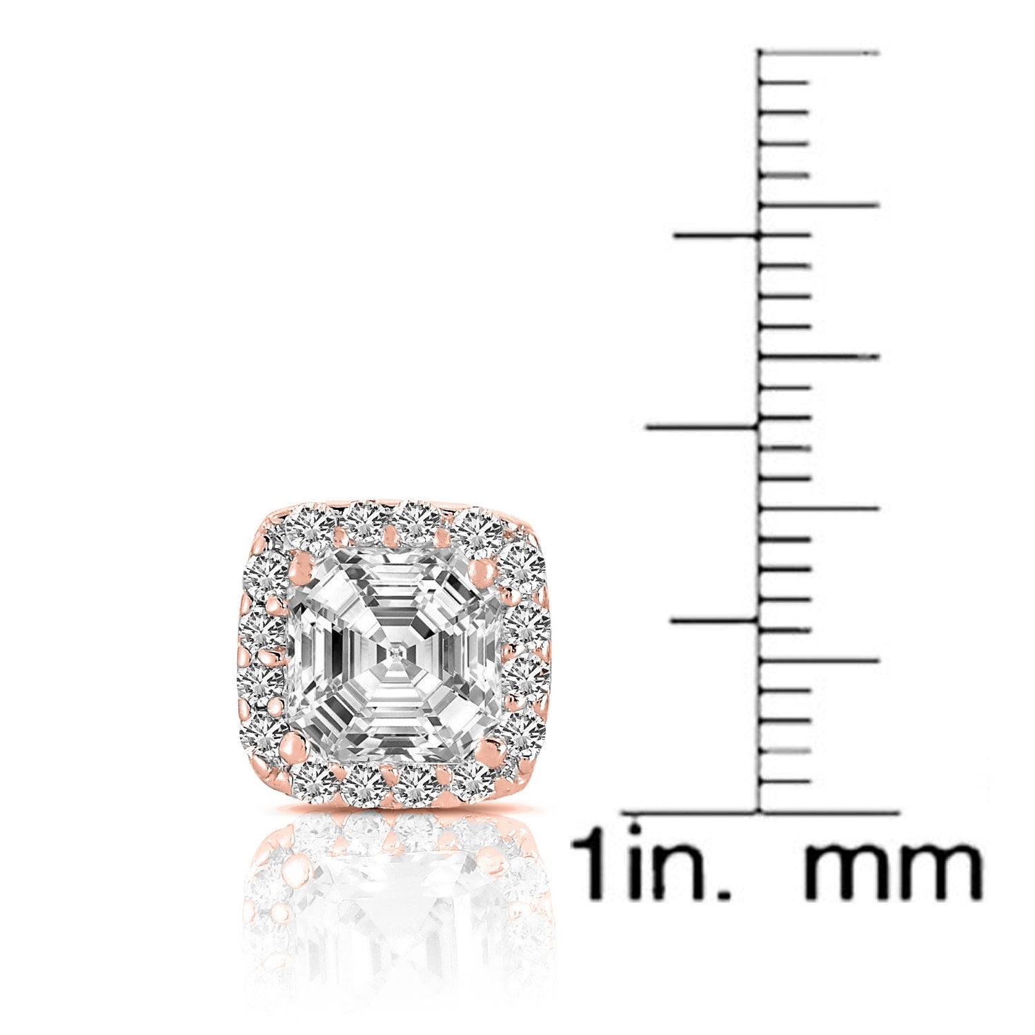 These stud earrings are crafted from .925 sterling silver with rose gold plating. They feature an Asscher-cut clear cubic zirconia stone surrounded by brilliant clear round cubic zirconia stones. They secure with a butterfly closure.