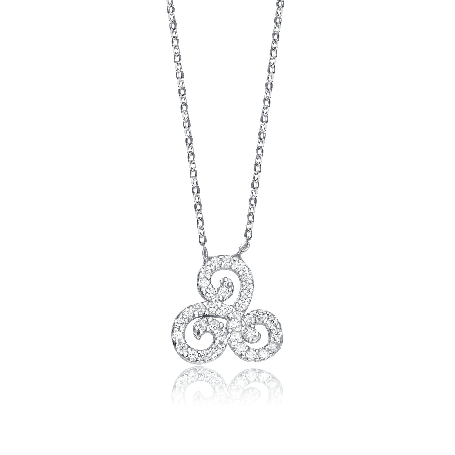 This White Gold Overlay Clear Cubic Zirconia Triple Knot Necklace by Genevive Jewelry is a romantic and elegant accessory. The intricate triple knot design, encrusted with clear cubic zirconia, creates a beautiful and sparkling centerpiece. Crafted from sterling silver with white gold plating, this necklace is perfect for a special occasion or as a thoughtful gift.