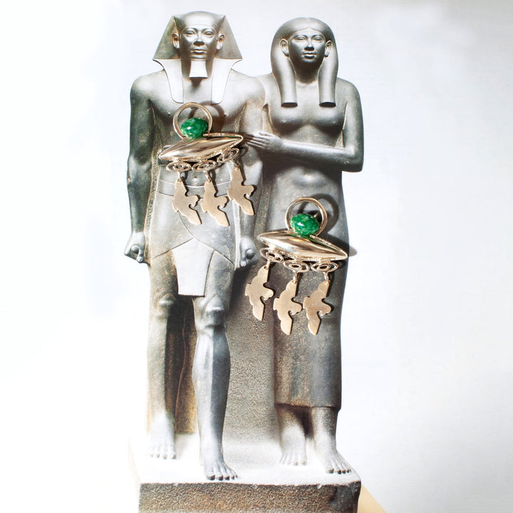 These Horus Earring In Sea by Castlecliff are a stunning celebration of Egypt Revival, designed to feel like a timeless artifact from a forgotten era. The metallic bird fringe sways with a captivating movement, while the large vintage glass stones add a luxurious, antiquated feel. Each pair is a unique statement piece that speaks to the eternal beauty and mystery of an ancient civilization. The handcrafted nature of these earrings means that every slight variation is a testament to the artisan's touch, imbuing them with a soulful, one-of-a-kind character.