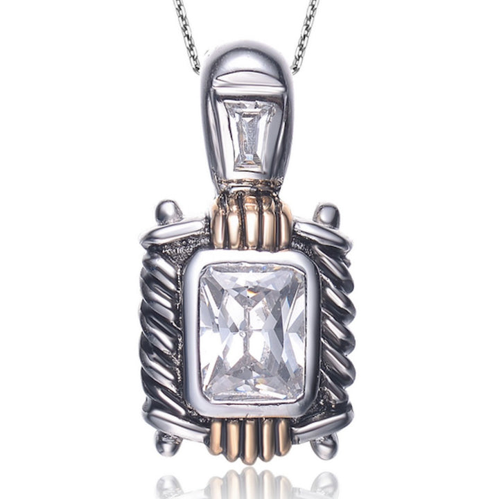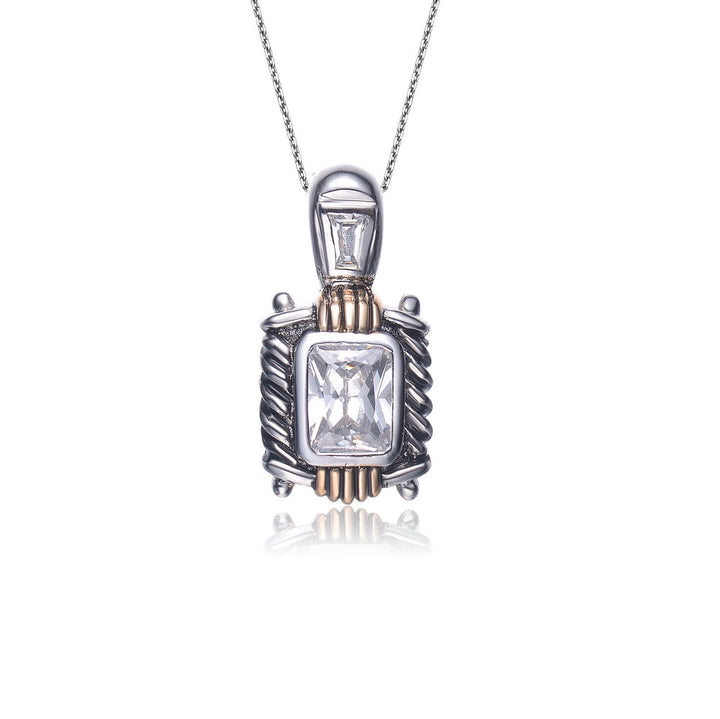 This necklace is crafted from sterling silver and features a clear cubic zirconia at its core.