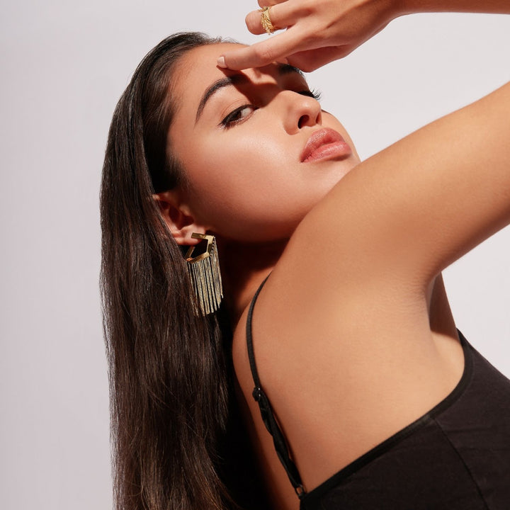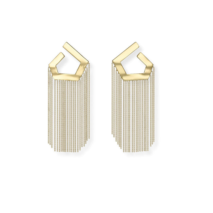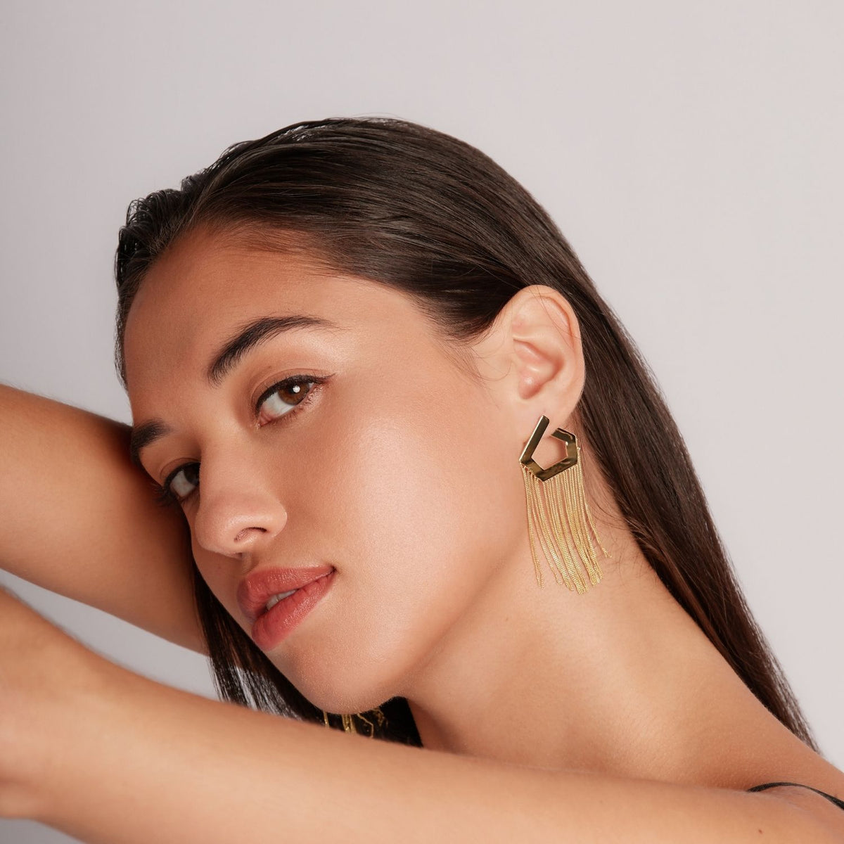 These Ebe Earrings by Risqué are an exquisite and alluring statement piece designed to epitomize sophistication and confidence. The unique five-angle polygon design and multiple long chains create a mesmerizing optical illusion and a sense of graceful movement. As they sway, they exude a sexy and cool vibe, perfect for those who want to make a bold, stylish statement. These earrings are ideal for adding a touch of dynamism and drama to any look.