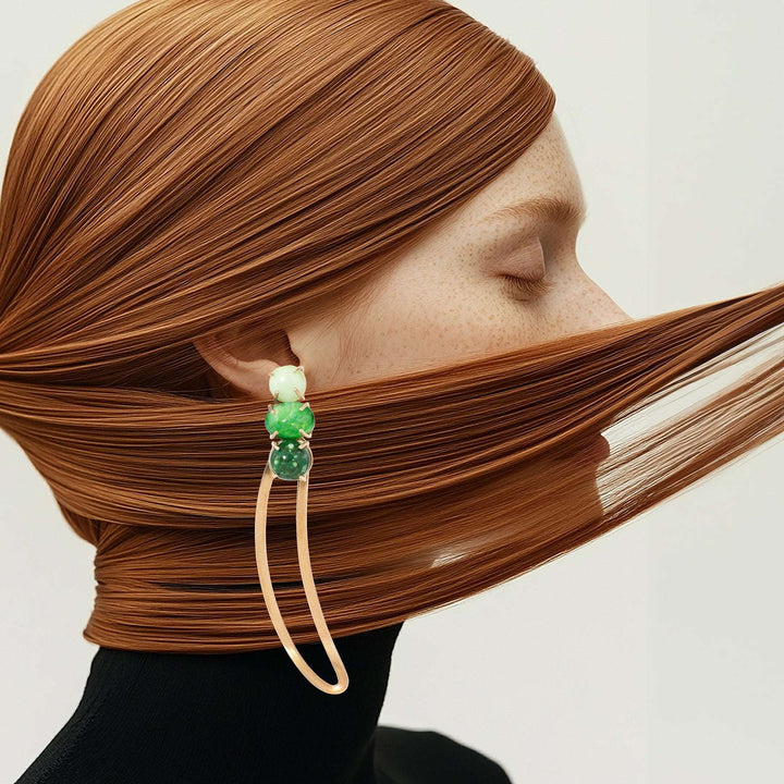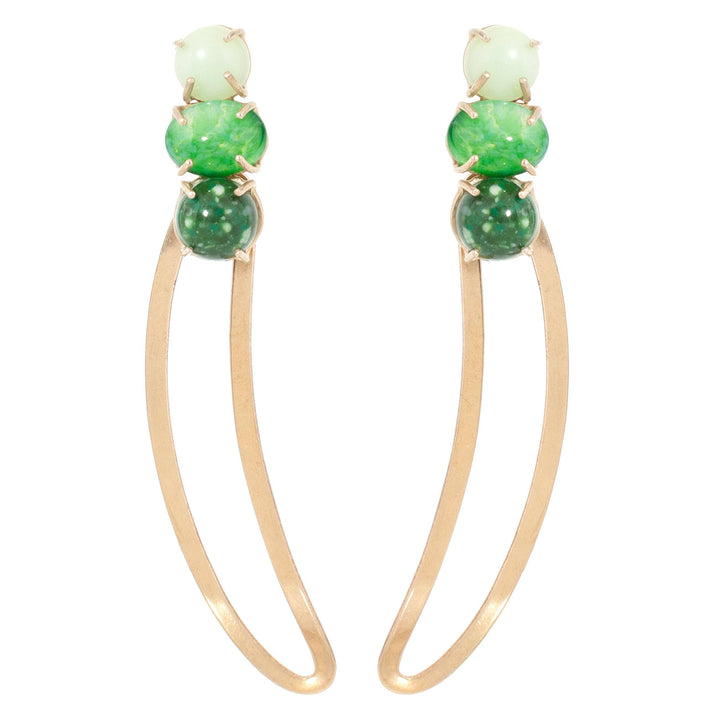 These Ondine Earrings in Fern Green by Castlecliff are an artistic and elegant accessory. They feature an airy, organic form that sways with subtle elegance. Each earring is cast in 100% certified recycled brass and assembled with upcycled metal components, making them a sustainable choice. Suspended from a trio of hand-set vintage glass stones in varied green tones, these lightweight earrings offer a refined statement rooted in sustainability and vintage charm.