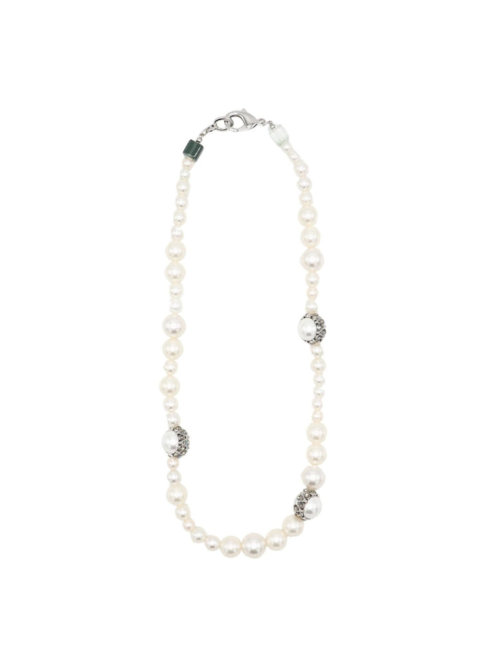 Handmade necklace featuring pearl beads with crystal cores and square green crystals; total length 65cm; weight 125g.