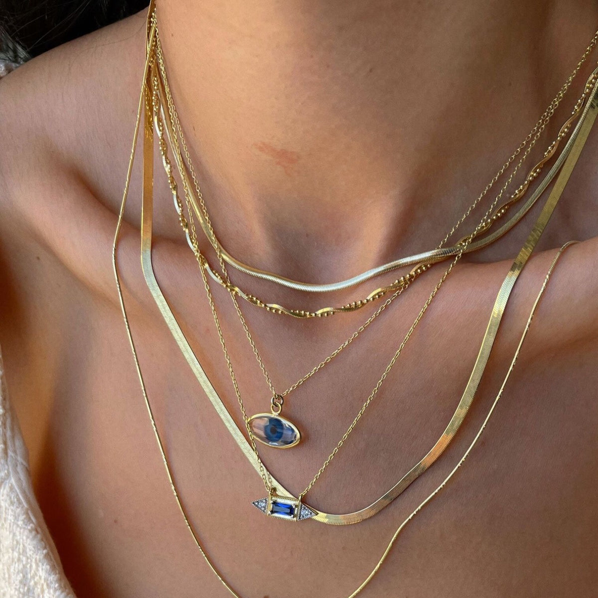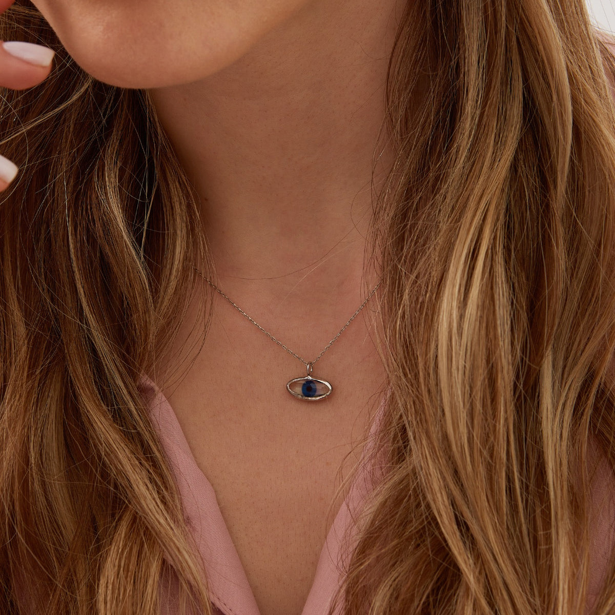 This necklace is crafted from 925 sterling silver metal with a gold tone. It features a stunning transparent glass evil eye and an adjustable chain.