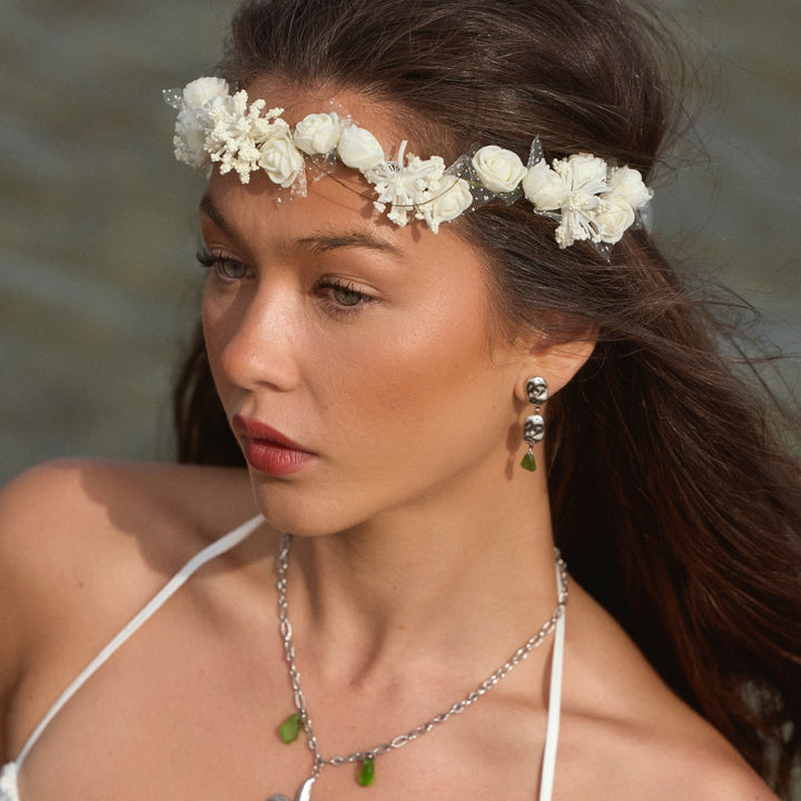 These earrings are crafted from surgical steel with genuine green sea glass. They are waterproof.