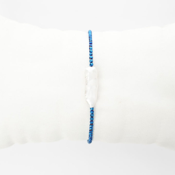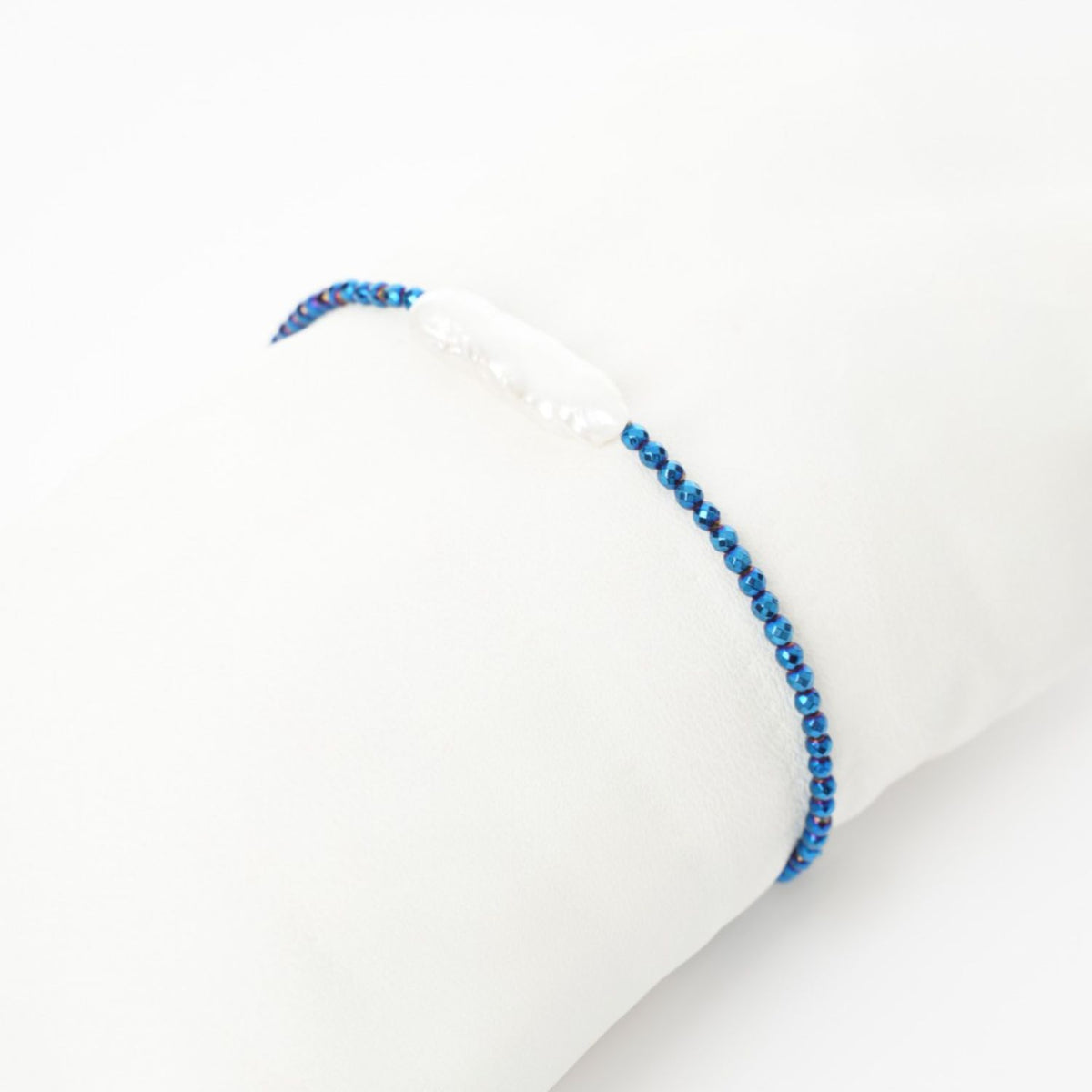 These Blue Bracelets by Margot Vii are true artisanal jewels handcrafted in the Gulf of Saint-Tropez. They are adorned with hematite, Tahitian pearls, and mother-of-pearl, highlighting the beauty of nature with an exotic touch. Each bracelet is unique, reflecting the passion and expertise of the craftsmen, making it a perfect, timeless piece for a sophisticated outfit.