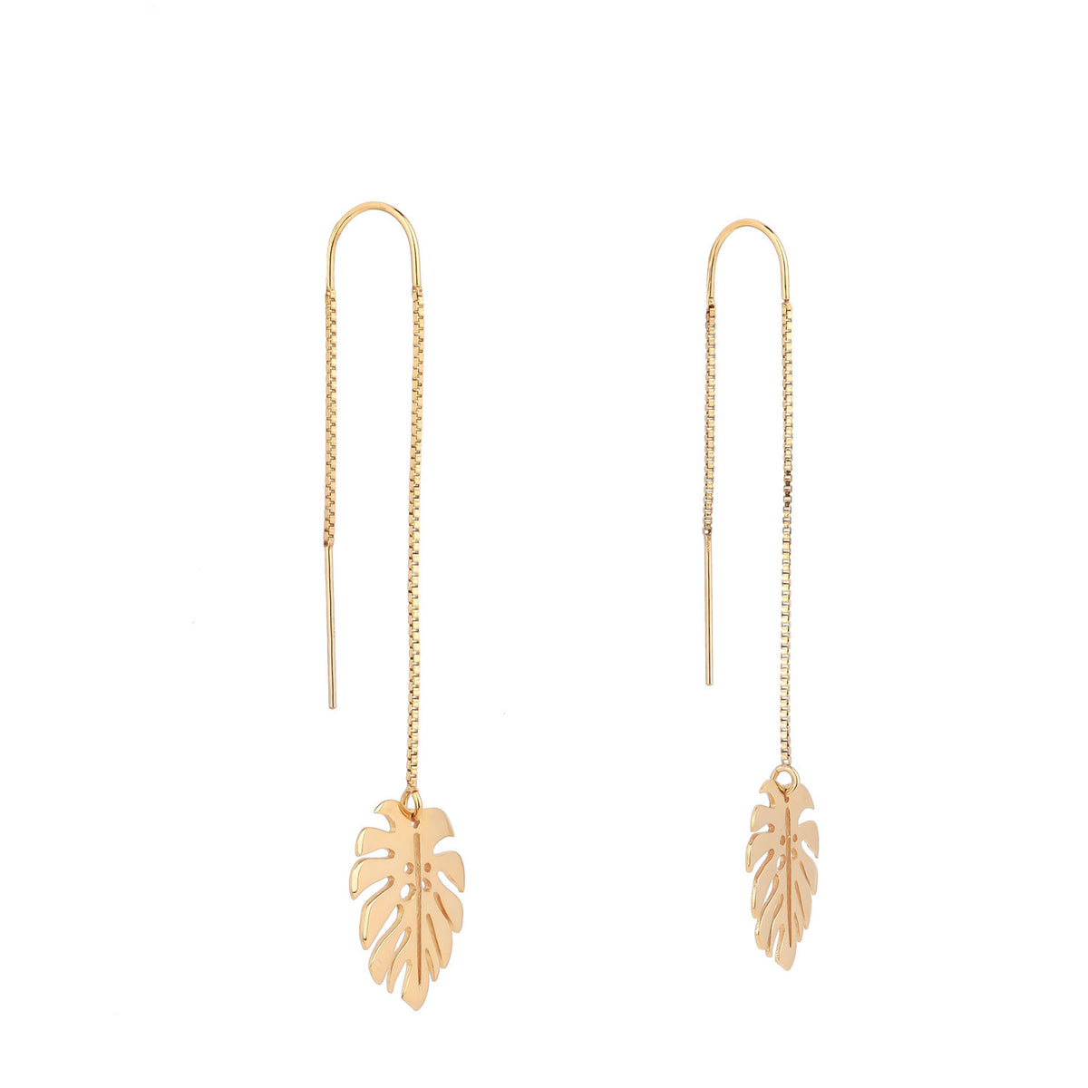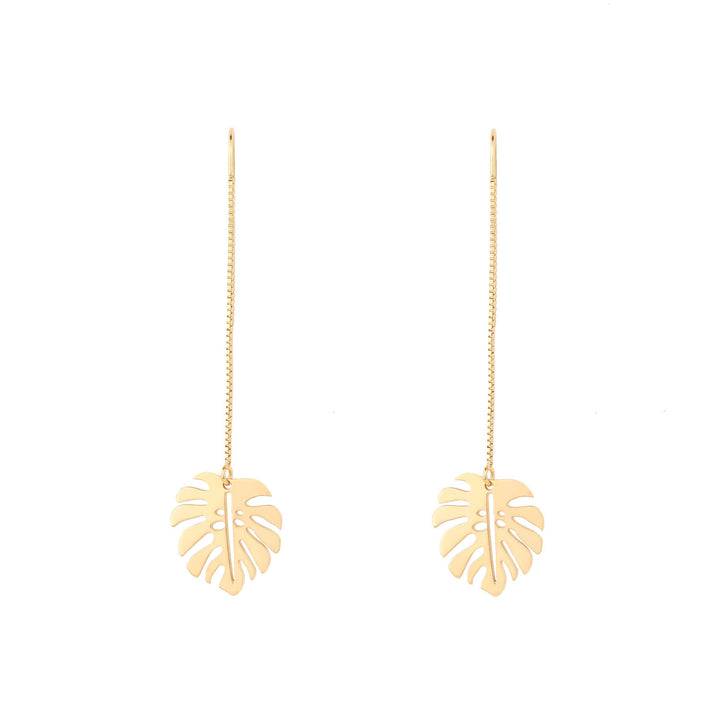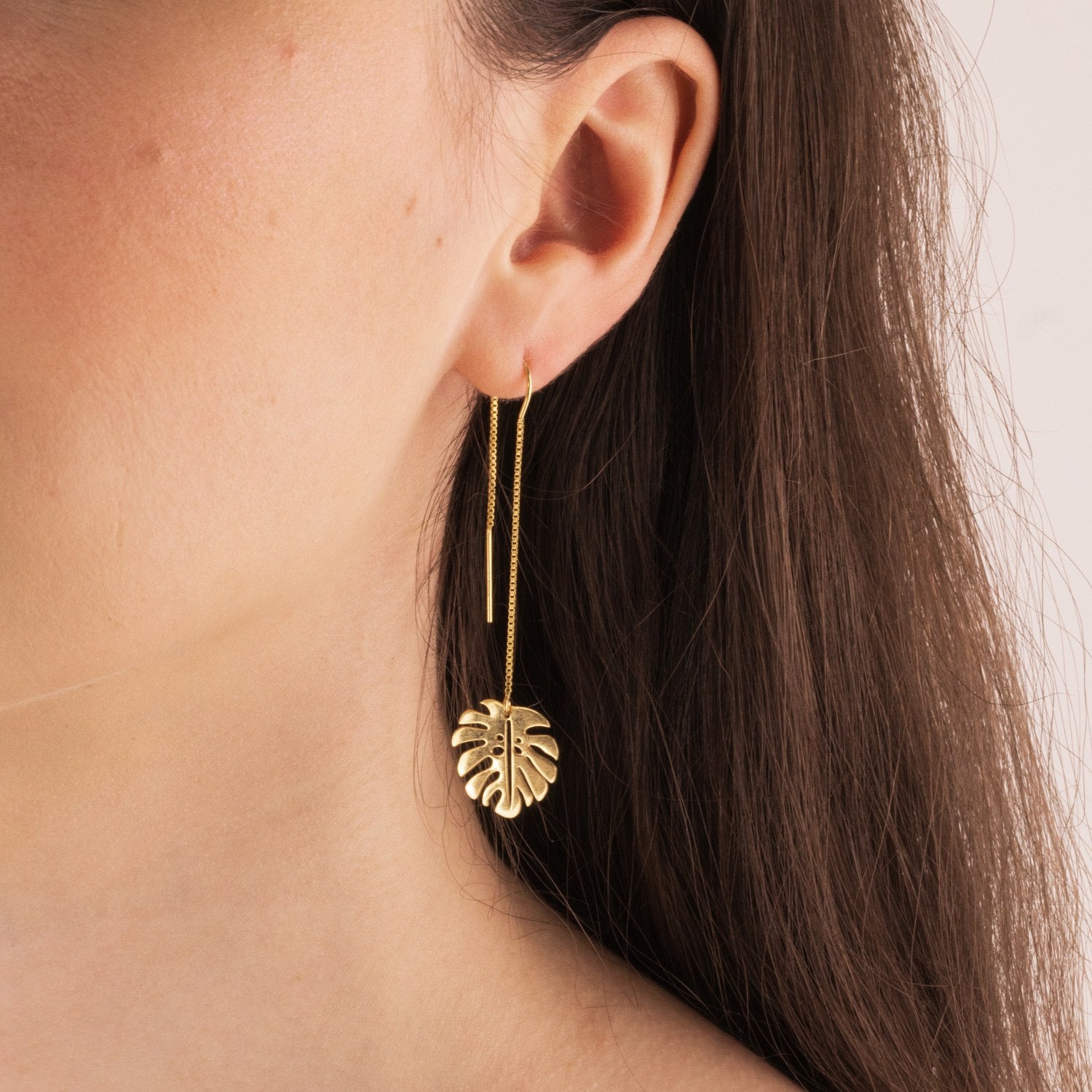 These earrings are designed to thread through the ear piercing. They are made with recycled 14K gold-filled monstera leaves. The design is minimalistic and nature-inspired.
