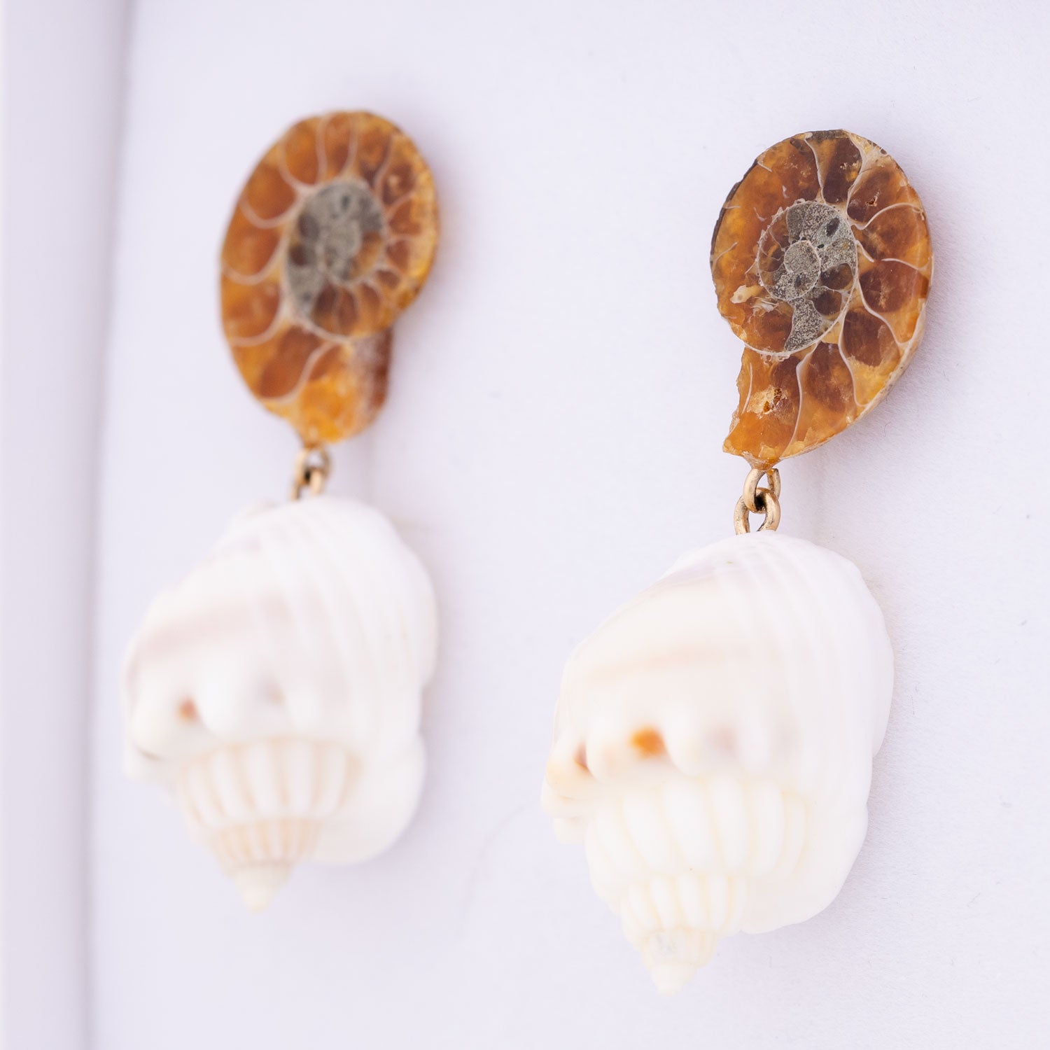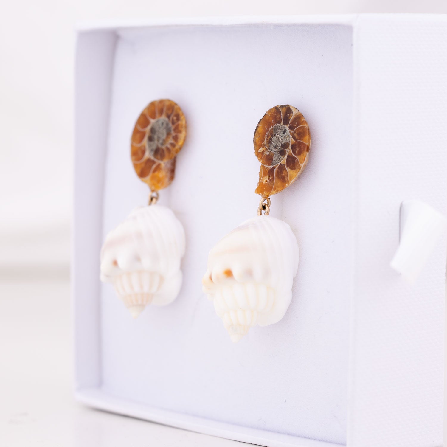 Ammonite Fossils White Seashells Shells Earrings Gold Studs