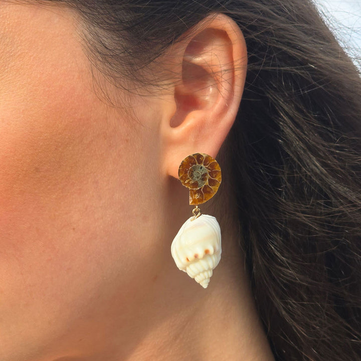 These earrings feature real ammonite fossils and ethically sourced seashells. The studs are made from 14-karat gold-filled material.