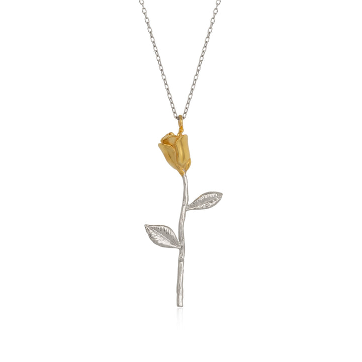 This necklace is designed from recycled sterling silver. It features a rose floral and petal design in a combination of gold and silver tones. It has an adjustable chain and a lobster clasp.