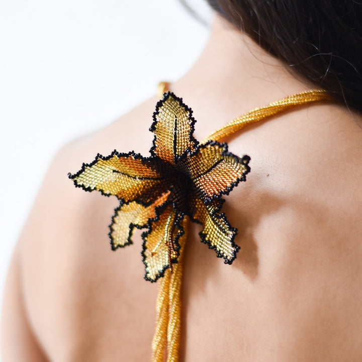 This Selva Gold Orchid Necklace by Manuela Cabrales is a tribute to Colombia's national flower, lovingly hand-woven by Inga artisans. Each bloom is meticulously shaped petal by petal from shimmering glass beads, capturing the community's celebrated bead-work techniques. This necklace is a beautiful piece of art and a symbol of cultural heritage, offering a unique and elegant connection to nature and history.