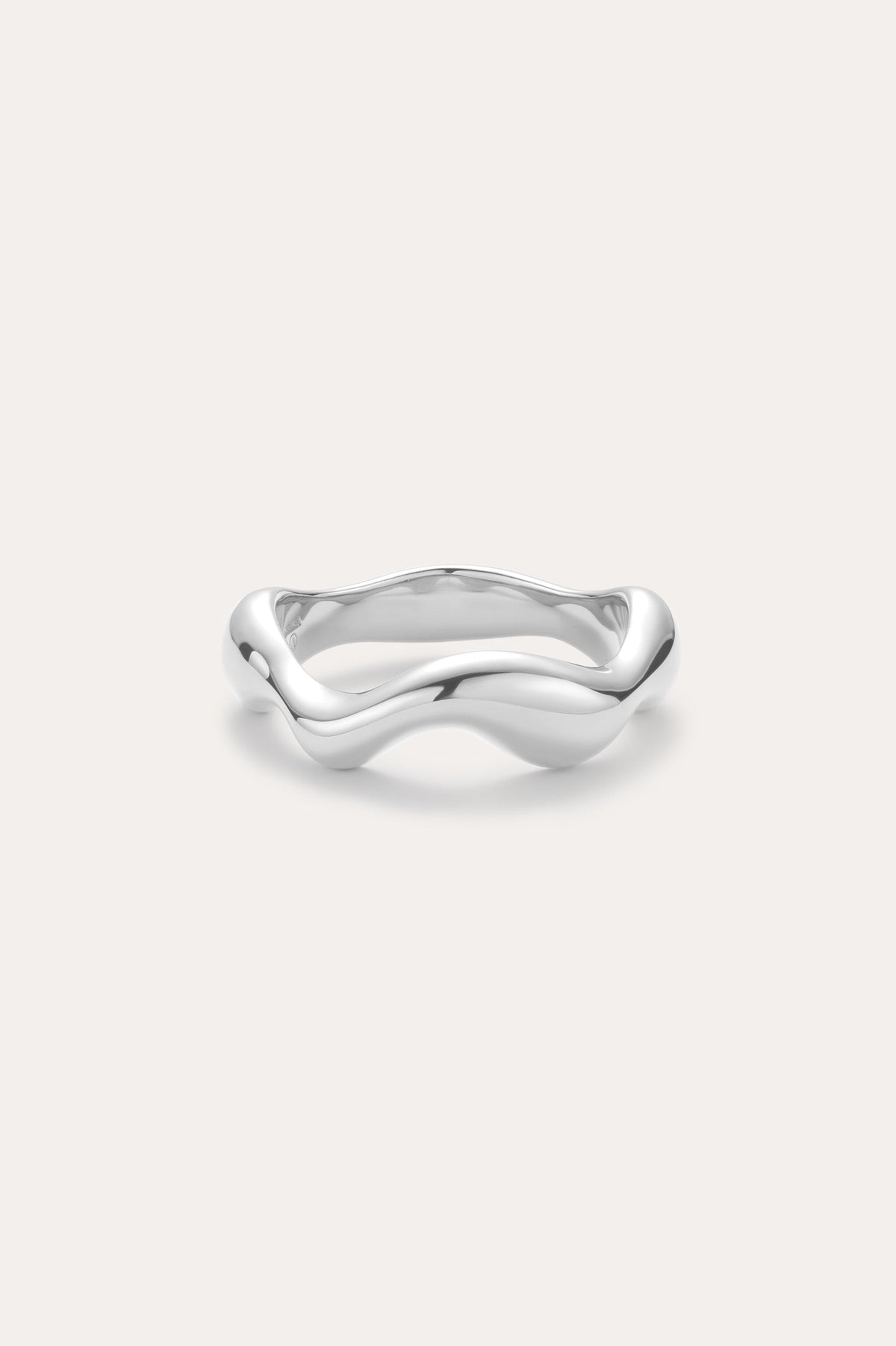 This chunky ring is crafted from 92.5% pure silver with an anti-tarnish layer. Its shape is fluid and irregular.